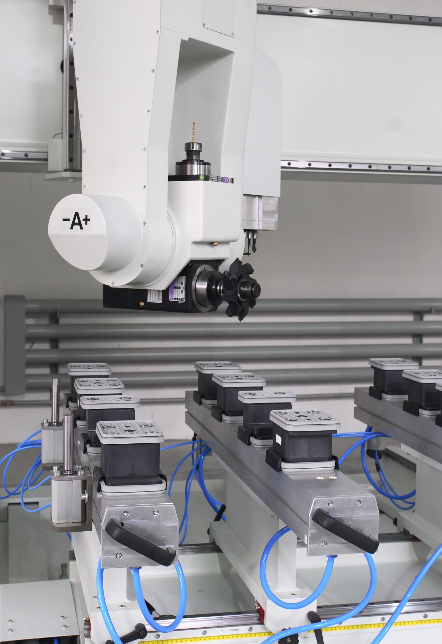 W rzeczywistości jednak maszyna posiada 4 niezależne osie interpolowane, gdyż ruch każdego z dwóch stołów jest napędzany przez odrębny serwomotor. Zespół roboczy maszyny zawiera 6 wysokoobrotowych elektrowrzecion (24 000 obr./min) chłodzonych powietrzem, które są zamontowane na wspólnym suporcie i pracują jednocześnie w osiach: poprzecznej – X oraz pionowej – Z. Ruch wzdłużny jest realizowany przez stoły robocze – podwójna oś interpolowana Y z niezależnymi napędami. Wrzeciona są zamontowane na wspólnym suporcie w stałym rozstawie 400 mm. Dzięki temu jest możliwe wykonywanie jednocześnie równoległej obróbki sześciu takich samych elementów.