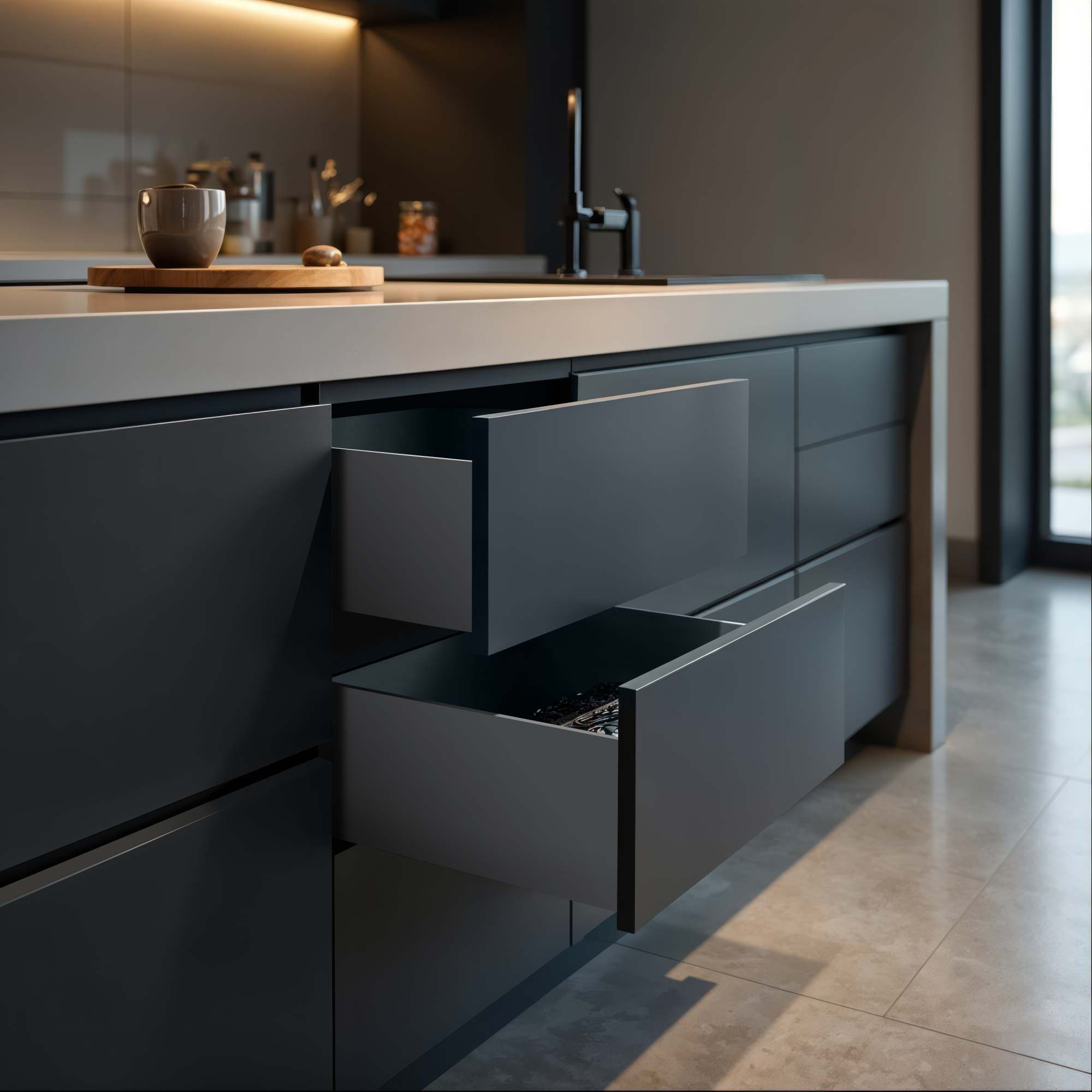 ELITE BOX to nowoczesny system szuflad, który łączy stylowy wygląd, przemyślaną ergonomię i wygodę użytkowania. Wąskie boki, pełen wysuw, cichy domyk oraz opcjonalny system push-to-open sprawiają, że codzienne korzystanie z mebli staje się czystą przyjemnością.