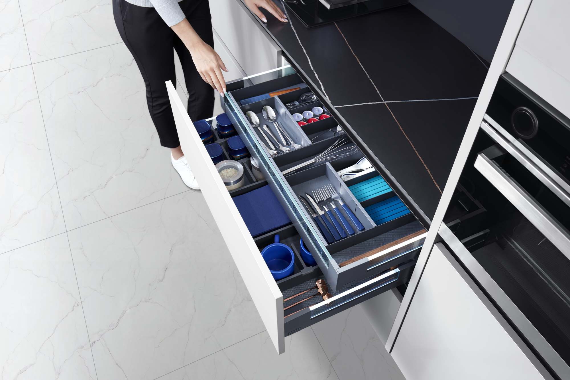 System obejmuje szuflady frontowe i wewnętrzne. Świetnie sprawdzi się w kuchni, łazience, garderobie i sypialni, a także w meblach biurowych. Dostępny jest w dwóch kolorach (biel, antracyt).