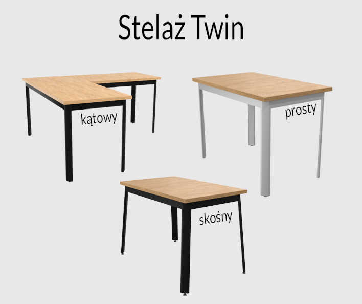 Wyrób ten jest oferowany w trzech wariantach: prostym, skośnym i kątowym. Może mieć barwę naturalnego aluminium albo kolor anody czarnej mat. Nośność stelaża wynosi 50 kg na jedną nogę.