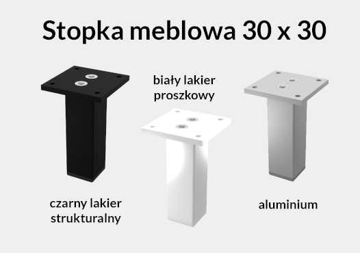 Asortyment stopek meblowych wzbogacił się o model wykonany z kwadratowego profilu aluminiowego 30 x 30 mm. Zakończa go podstawa wyprodukowana z wysokiej jakość tworzywa sztucznego, ewentualnie może to być regulator wysokości bądź zaślepka. Do dyspozycji klientów są 4 wysokości: 60, 100, 150 i 400 mm i 3 wersje kolorystyczne: aluminium, biały lakier proszkowy oraz czarny lakier strukturalny. Stopka posiada u góry aluminiową płytkę z czterema otworami montażowymi. Nośność produktu wynosi 60 kg. Również ta propozycja pod względem wzorniczym doskonale odpowiada na aktualne potrzeby klientów.