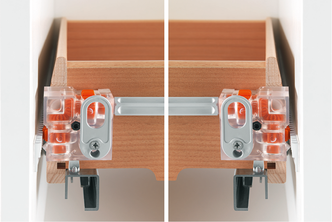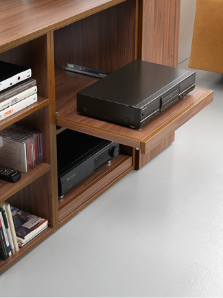 Producent znalazł także rozwiązanie w sytuacjach, gdy niemożliwe jest zamocowanie prowadnic do boku mebla. Prowadnice Shelf (zarówno push to open jak i soft-close) mocowane są do spodu mebla, dzięki czemu stanowią doskonałą podstawę pod wysuwany sprzęt grający, RTV, a także świetnie sprawdzą się w meblach sklepowych, w wysuwanych witrynach. Dzięki możliwości zastosowania trzech, a nawet czterech prowadnic jednocześnie znacznie zwiększono maksymalne obciążenie tak wysuwanej płaszczyzny.