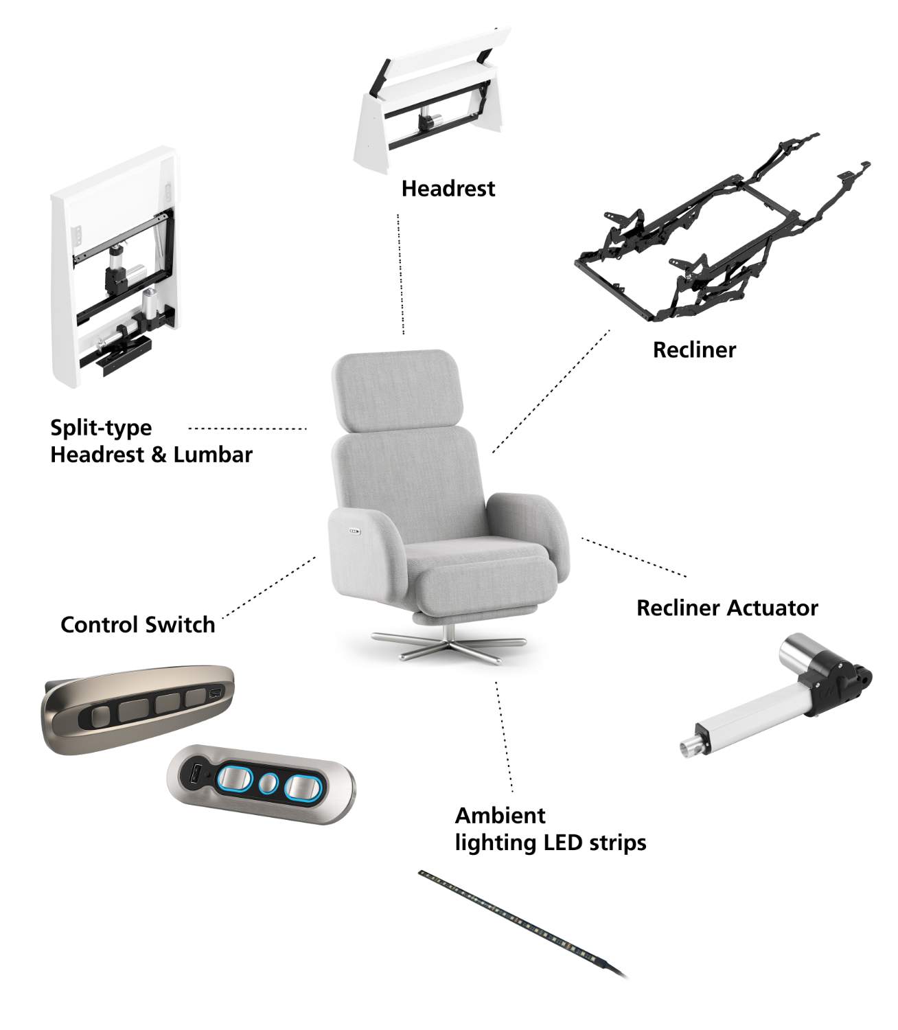 Niezależnie od tego, czy chodzi o estetyczne fotele, sofy czy indywidualnie regulowane łóżka, DewertOkin oferuje wysokiej jakości napędy i mechanizmy do mebli regulowanych elektrycznie. Optymalnie skoordynowane komponenty zapewniają maksymalny komfort użytkowania.