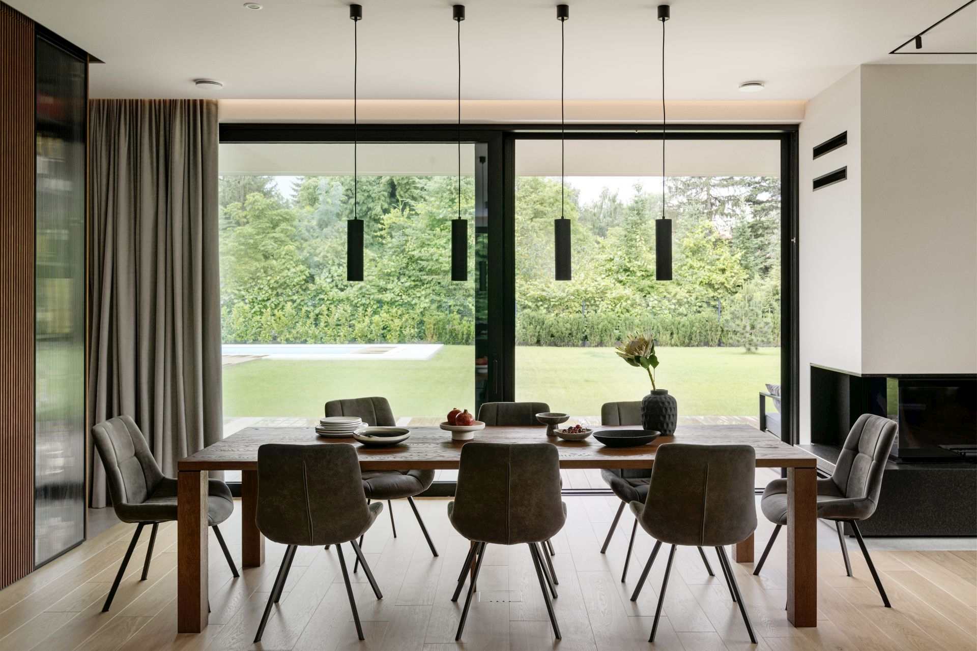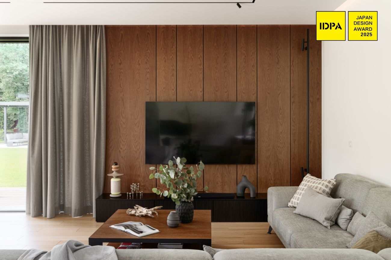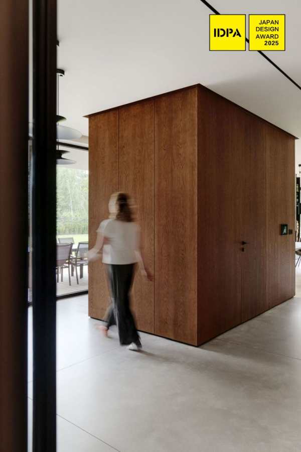 Kwintesencją estetycznej funkcjonalności jest minimalistyczny kubik, łączący różne strefy domu. Pokryty drewnianymi fornirami, wpisującymi się w wystrój wnętrza, ukrywa zintegrowany system szaf i drzwi. Kuchnia, wyposażona w bezuchwytowe fronty szafek i blat roboczy z jasnego spieku, zachwyca ergonomią i elegancją. Podobny klimat utrzymuje się w sypialniach i łazienkach. Willa wyposażona została w nowoczesny system smart home oraz ekologiczne rozwiązania – gruntową pompę ciepła i panele fotowoltaiczne. Całość dopełnia strefa wellness z siłownią, saunami i basenem.