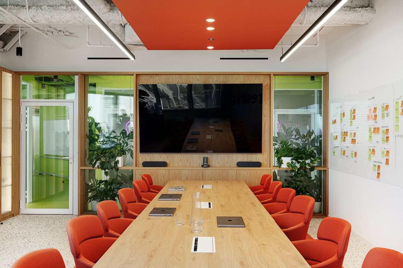 We wnętrzu biura styl nowoczesny, oparty na dynamicznej kolorystyce, przenika się z elementami soft loftu, widocznymi na przykładzie otwartych technicznych sufitów. Korytarze, sale konferencyjne i przestrzenie kreatywne wyróżniają się odważnymi akcentami kolorystycznymi, które ożywiają przestrzeń i pozytywnie stymulują zespół. Atrakcyjność biura dodatkowo wzbogacają efekty świetlne, takie jak neonowy napis „Make it happen”. W biurze nie brakuje również rozwiązań sprzyjających koncentracji i wyciszeniu. Strefy pracy indywidualnej powstały w oparciu o naturalne materiały i stonowane odcienie. Komfort akustyczny wspierają transparentne szklane przegrody oraz dźwiękochłonne budki telefoniczne, gwarantujące użytkownikom prywatność. Projekt wnętrza ukazuje, że we współczesnych biurach dbanie o ergonomię i funkcjonalność jest równie ważne, co inspirująca atmosfera pracy.