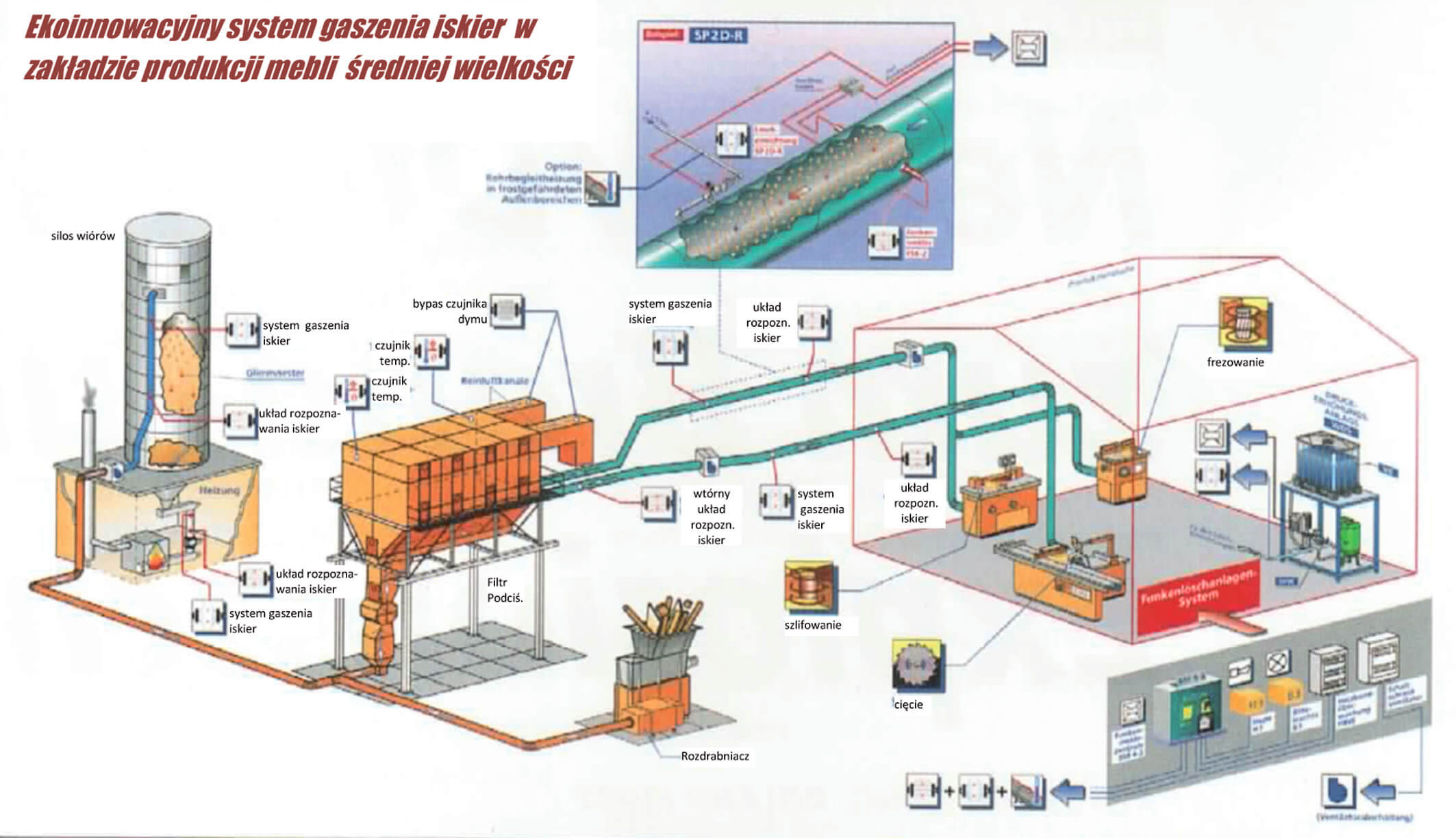 Warto zwrócić uwagę na to, że średnio w Europie codziennie dochodzi do jednej eksplozji pyłu. Niebezpieczeństwo takiego wybuchu istnieje w zakładach meblowych i stolarskich wszędzie tam, gdzie występują palne pyły, których stężenie w powietrzu osiąga odpowiednią wartość i gdzie istnieje źródło zapłonu. Aby to ryzyko wykluczyć, maszyny pracujące w tym przemyśle, a co za tym idzie instalacje odciągowe muszą być kontrolowane pod kątem tworzenia się iskier i zabezpieczone za pomocą odpowiedniej instalacji do ich gaszenia. Ekoinnowacyjne rozwiązanie funkcjonowania systemu gaszenia iskier jest przedstawione na zdjęciu nr 1.