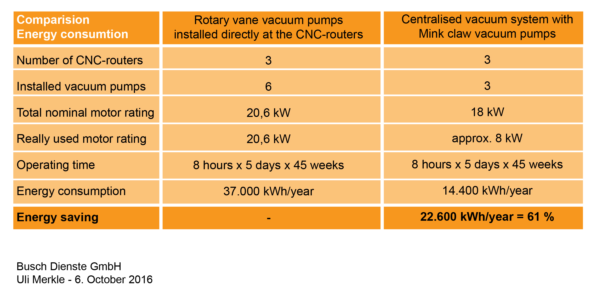Centralizacja dostarczania próżni z reguły wymaga mniejszej liczby pomp niż instalacja rozproszona, bezpośrednio w centrach obróbczych CNC. Z tego powodu sześć rotacyjnych łopatkowych pomp zainstalowanych wcześniej, zastąpiono trzema nowymi pompami próżniowymi Mink. Sześć wspomnianych pomp było w użyciu przez cały czas pracy zakładu. W praktyce okazało się, że w zespole scentralizowanego systemu próżniowego tylko jedna pompa próżniowa Mink działa z częstotliwością 50 Hz w czasie godzin pracy, a druga jest czasami włączana automatycznie, ale tylko na krótko i zazwyczaj z mniejszą częstotliwością. Zużycie energii w firmie Kvist spadło o 61%, czyli 22 600 kilowatogodzin rocznie, na samej produkcji mebli do siedzenia. Drugi scentralizowany system próżniowy wykorzystywany do produkcji stołów umożliwia osiągnięcie podobnych wyników.