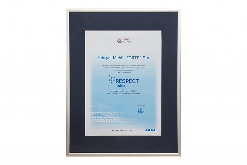 FABRYKI MEBLI „FORTE” S.A. dołączyły do elitarnego grona 25 spółek warszawskiej Giełdy Papierów Wartościowych notowanych w Respect Index.