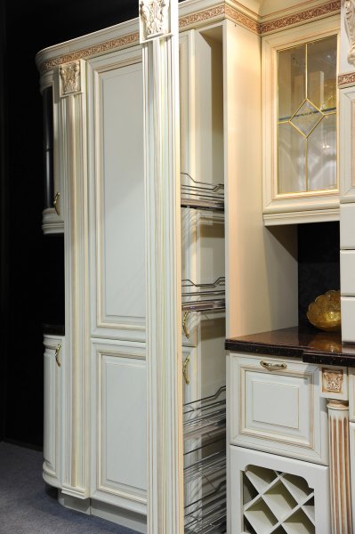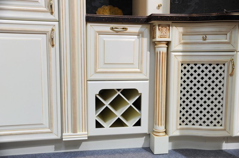 Również tu firma Drewpol ma ciekawą propozycję. W architekturze starożytnej kolumna była solidną podporą, zaś w kuchni spełnia jeszcze jedną funkcję – ozdabia, upiększa, a to dzięki zwieńczeniu z motywem roślinnym, który nawiązuje do dekoru zastosowanego w cargo. Pionowe żłobienia na trzonie kolumny, podkreślone patyną, nadają jej lekkości i również współgrają z trzonem w cargo. Podstawa kolumny, masywna, stojąca bezpośrednio na podłodze zdaje się podtrzymywać blat i stanowi solidną bazę dla lekkiego trzonu i finezyjnie zdobionego kapitelu.