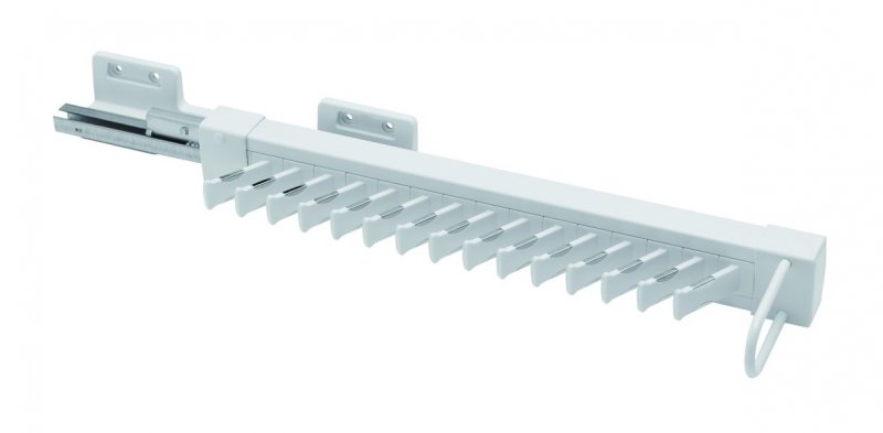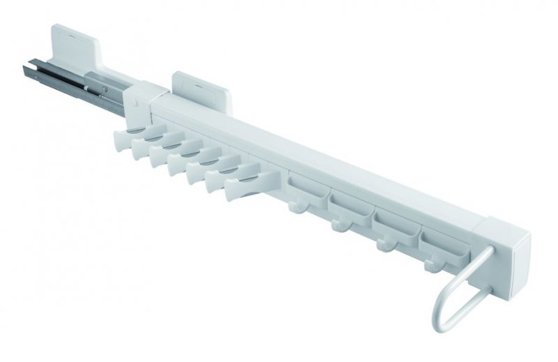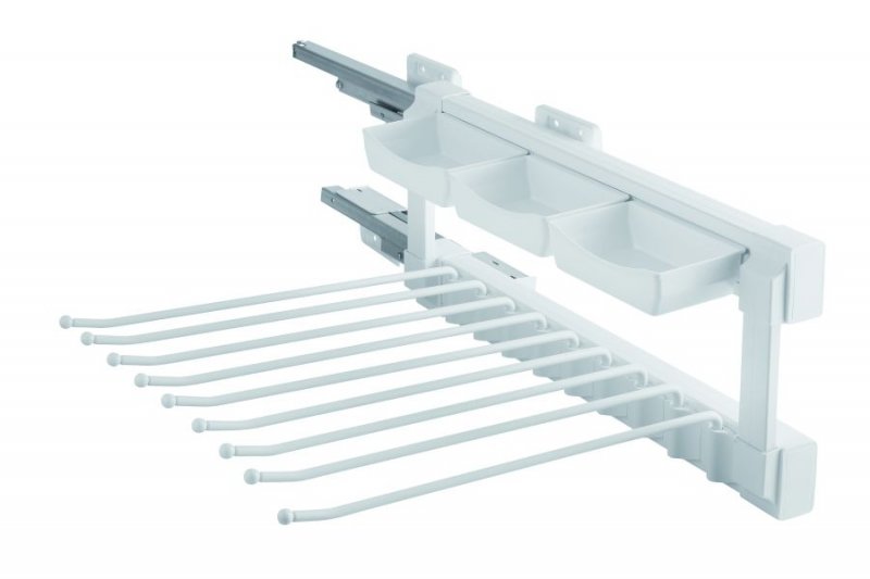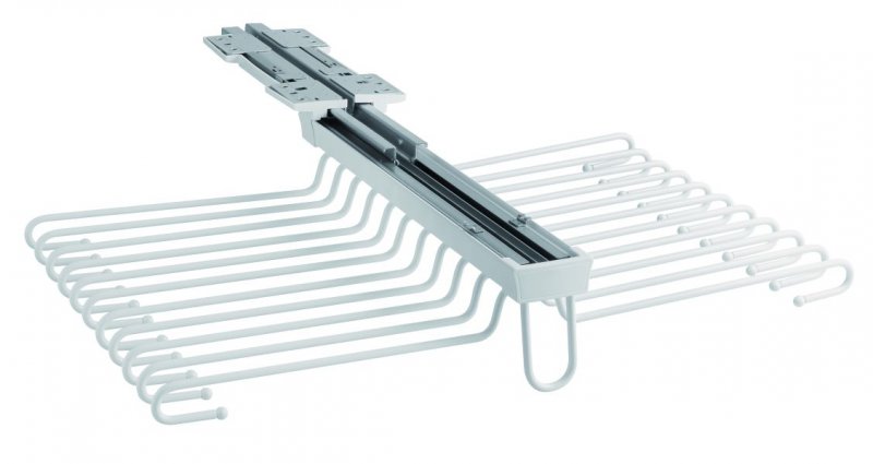 Możemy na nim umieścić spodnie, paski, a także akcesoria potrzebne do pielęgnacji i czyszczenia odzieży. Wieszak może pomieścić 14 par spodni i posiada specjalnie zaokrąglone końcówki, które zabezpieczają przez wysunięciem się odzieży. Podobnie jak pozostałe akcesoria GTV, tak i wieszak na spodnie wysuwa się w całości dzięki czemu użytkownik zyskuje pełny i swobodny dostęp do zawartości szafy.
