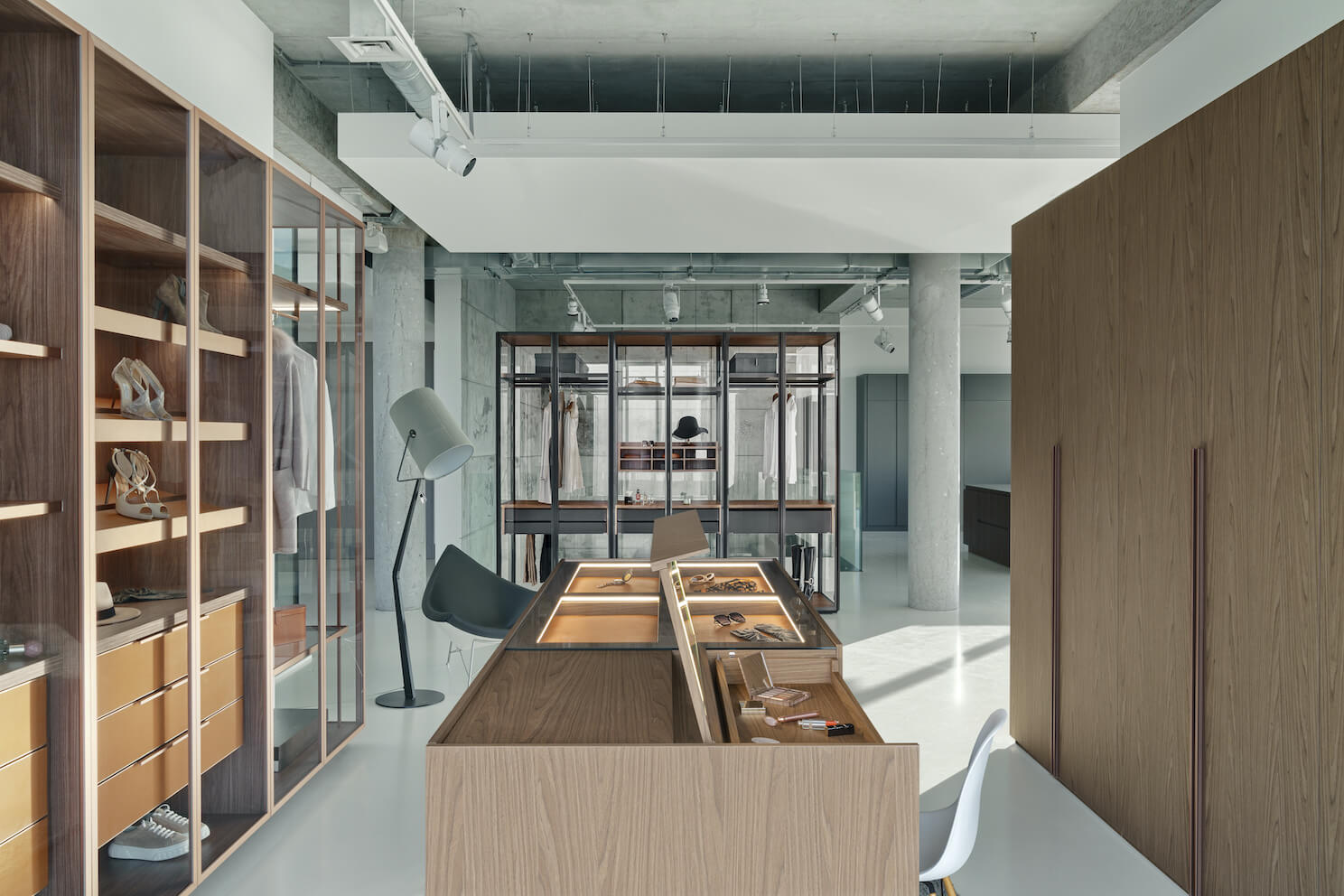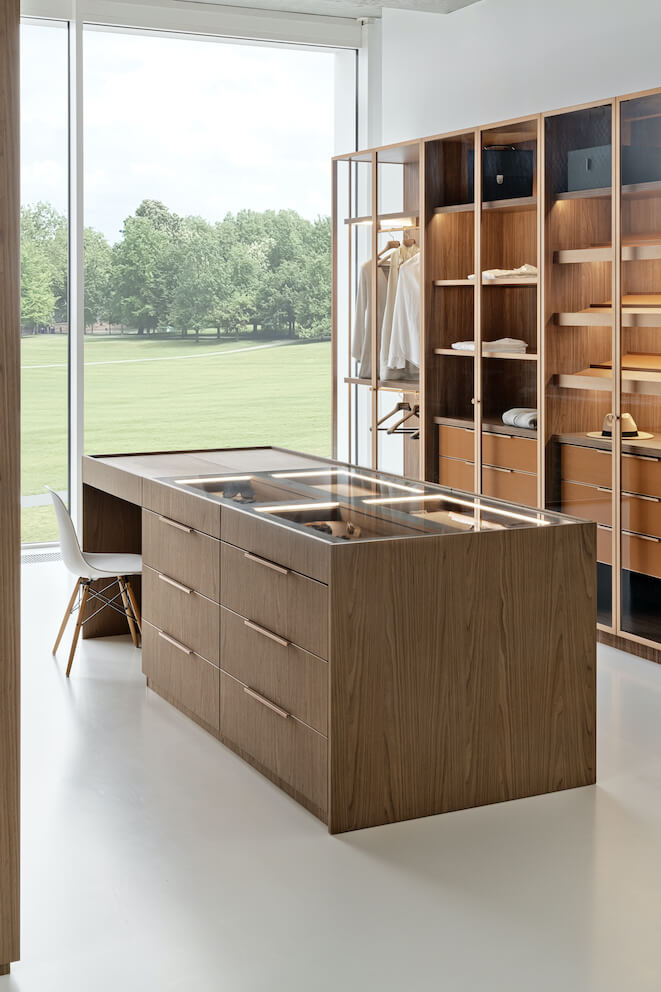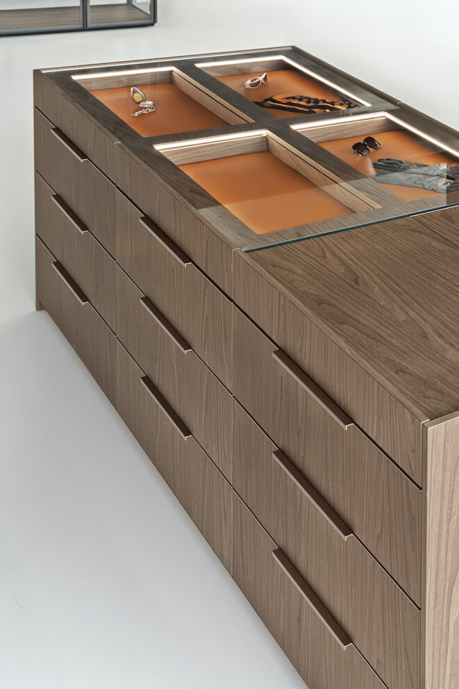 Świetnym pomysłem jest zamontowanie szaf wzdłuż ścian oraz ulokowanie komody-wyspy w centrum pomieszczenia. To rozwiązanie bardzo funkcjonalne i estetyczne. Część wysokiej zabudowy możemy wyposażyć w pełne drzwi i przeznaczyć na płaszcze, kurtki oraz elementy garderoby, po które sięgamy rzadziej. Natomiast na lżejsze ubrania oraz te, z których jesteśmy szczególnie dumni czy kolekcje designerskich butów możemy ulokować w przeszklonych szafach-witrynach. Będą tam pięknie wyeksponowane w czym pomoże liniowe oświetlenie ledowe. Zupełnie jak w luksusowych butikach.