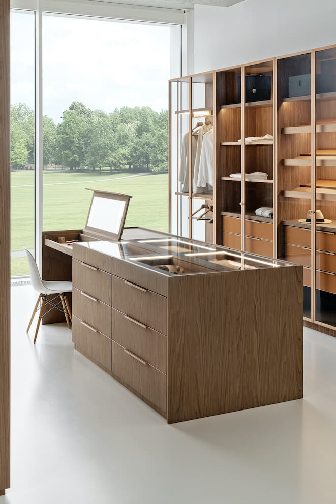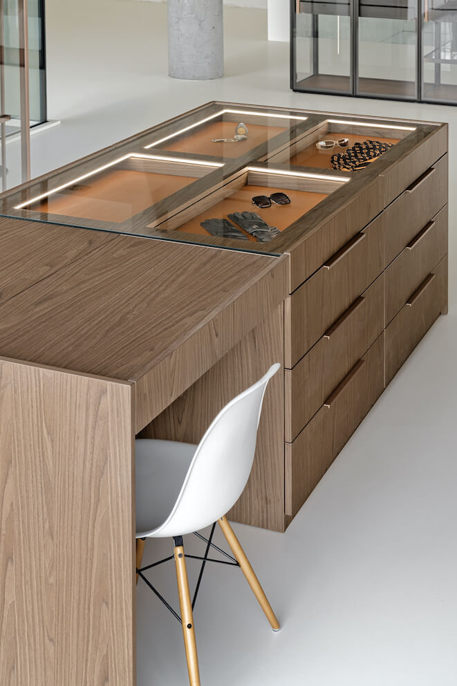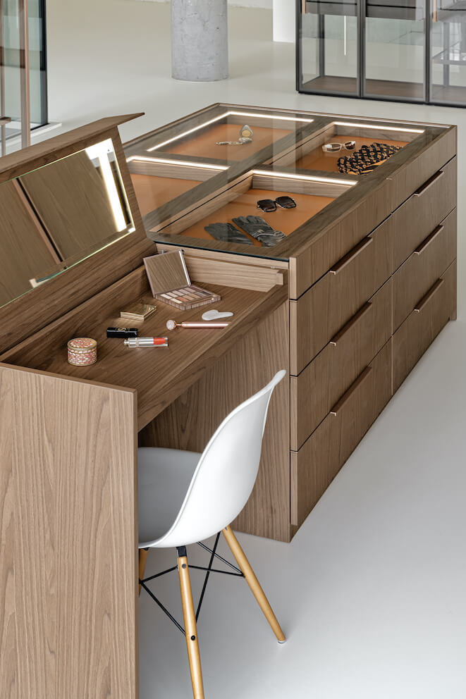 Szukając udogodnień w garderobie wspierających sprawne przygotowanie się do wyjścia z domu marka ZAJC proponuje do niej wielofunkcyjną wyspę. Z meblem zintegrowana jest… toaletka z zamykanym lustrem i miejscem na kosmetyki.