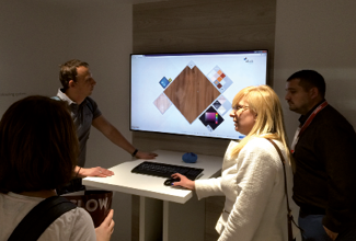 Cały czas ważnym tematem we wzornictwie są sosny. Na stoisku Impress Decor pokazywano Sosnę Szkocką w bardzo szerokiej gamie kolorów, od bursztynowego do prawie białego, białoniebieskiego. Obecnie sosna zdobywa przychylność projektantów nawet w kojarzonej głównie z ciemnymi barwami dekorów południowej Europie.