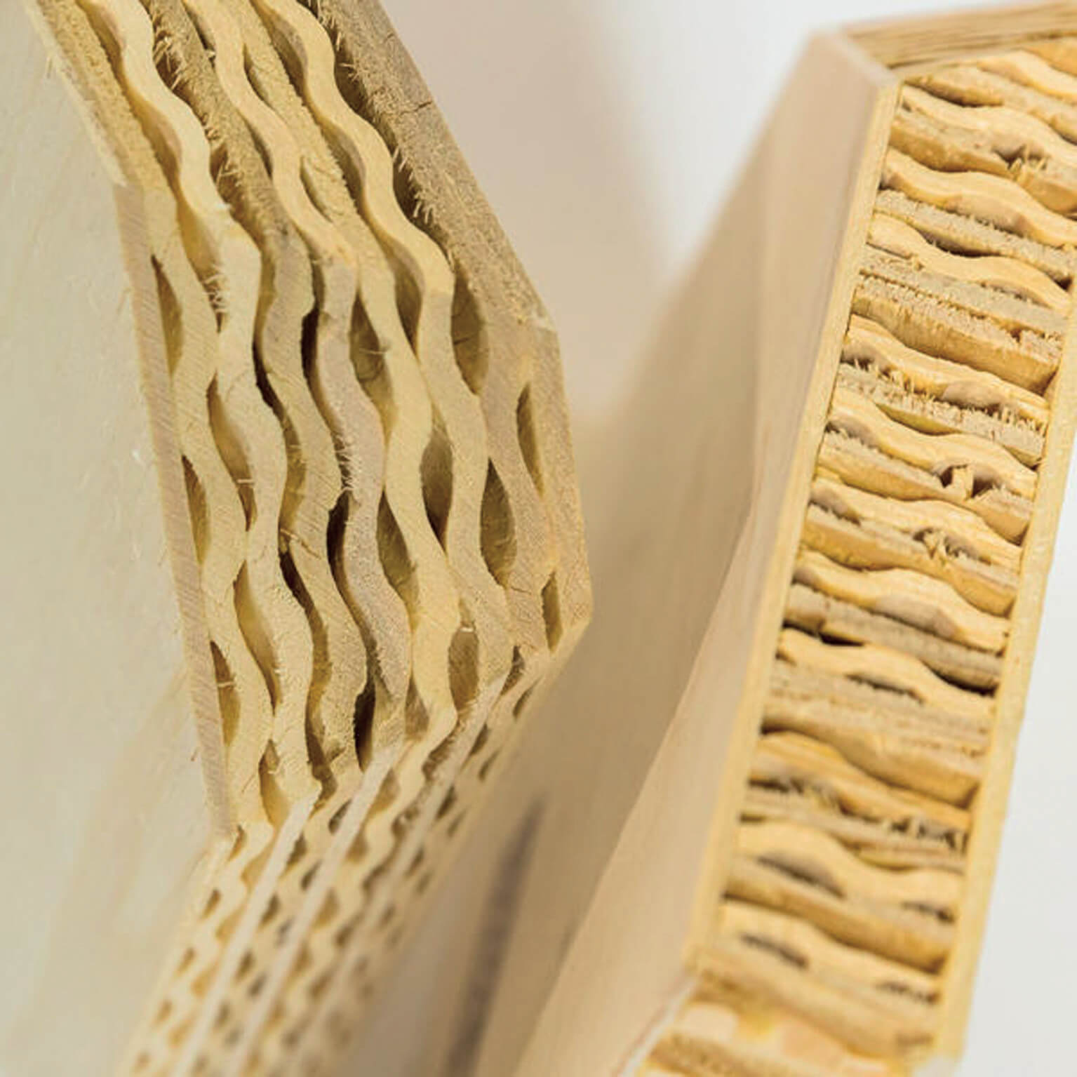 aerowood® to płyta wykonana z drewna i powietrza. Jej rdzeń wytworzono w całości z drewnianej, pofalowanej okleiny, co pozwoliło uzyskać stabilne i bardzo lekkie panele. W wersji „aerowood light” struktura falista jest rozłożona po całości, dzięki czemu uzyskano wysoką wytrzymałość na zginanie, czyniąc jednocześnie produkt bardzo lekkim dzięki powietrzu zamkniętemu w kanałach powietrznych. Natomiast „aerowood compact” jest przygotowany pod kątem zastosowań w budownictwie, dlatego zastosowano fale pionowe, uzyskując wysoką nośność i doskonałe rozpraszanie obciążeń.
