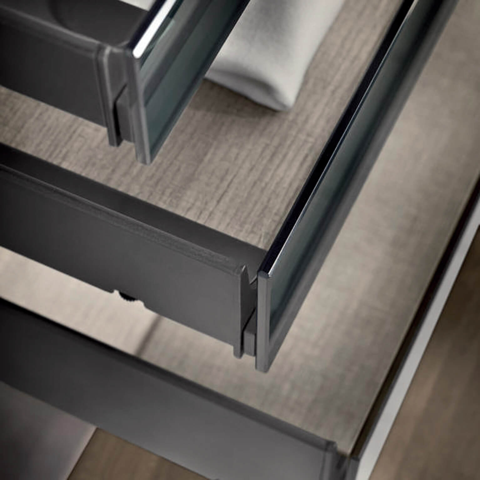 Jest to bardzo elegancki, indywidualnie konfigurowany system szuflad do szaf. Produkt wyróżnia się minimalistycznym designem i precyzyjnym wykończeniem. Aluminiowe szuflady są dostępne w różnych wysokościach i można je dopasować do szafy za pomocą wymiennych paneli przednich wykonanych z drewna lub szkła. Szczególną cechą Excessories jest to, że szklany panel przedni jest nieco oderwany od panelu bocznego, nadając szufladzie bardzo filigranowy wygląd.