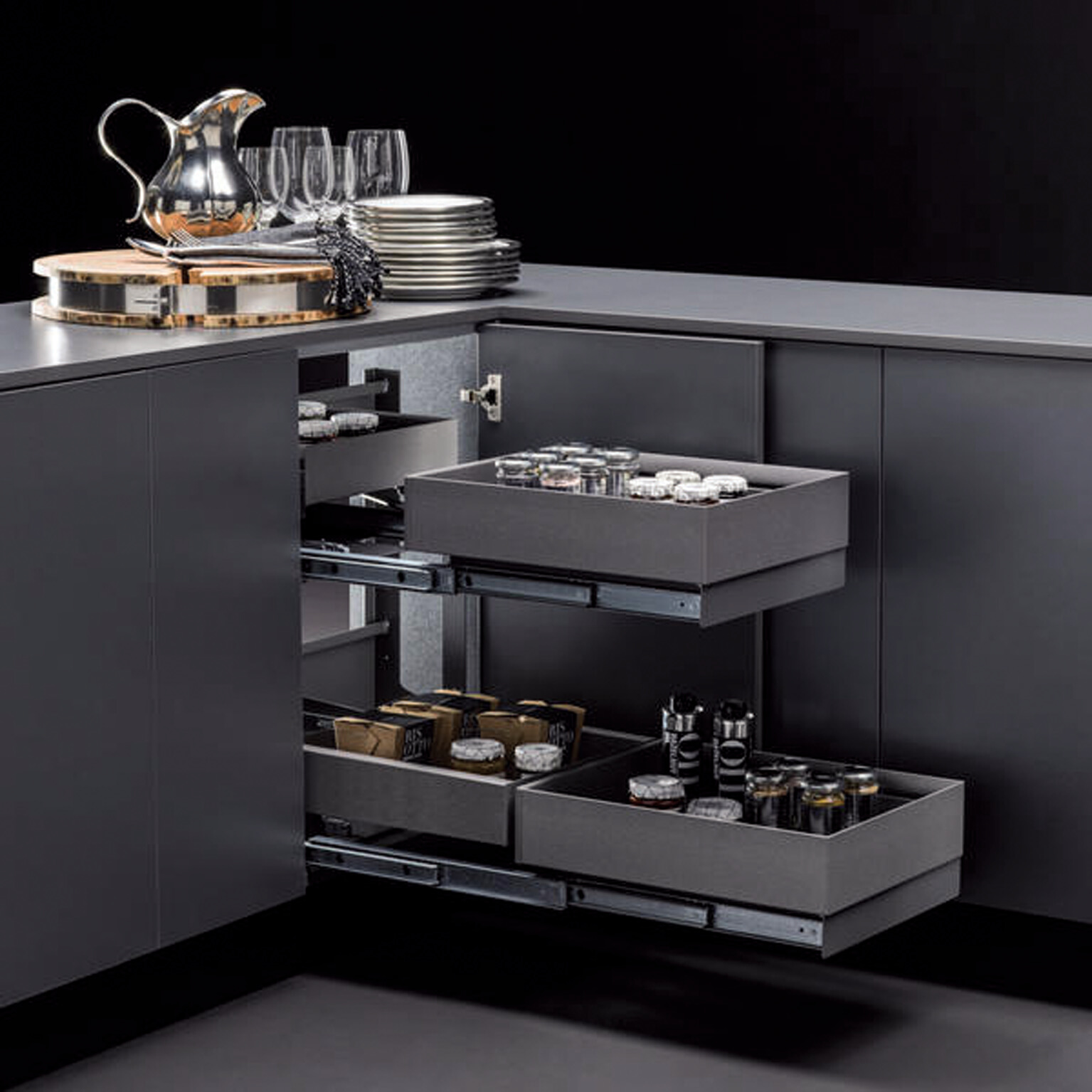 Fly Box to innowacyjne rozwiązanie do szafki narożnej, w którym dwa przedziały umieszczone jeden za drugim można wyciągnąć z narożnej szafki jednym ruchem. Dzięki prowadnicy tylna skrzynka umieszczona w rogu automatycznie się rozkłada, umożliwiając całkowite wysunięcie obu komór z dolnej szafki. Ta specjalna konstrukcja zapewnia optymalne wykorzystanie przestrzeni magazynowej i zapewnia łatwy i wygodny dostęp do przechowywanych przedmiotów. Fly Box ma nośność 30 kg.
