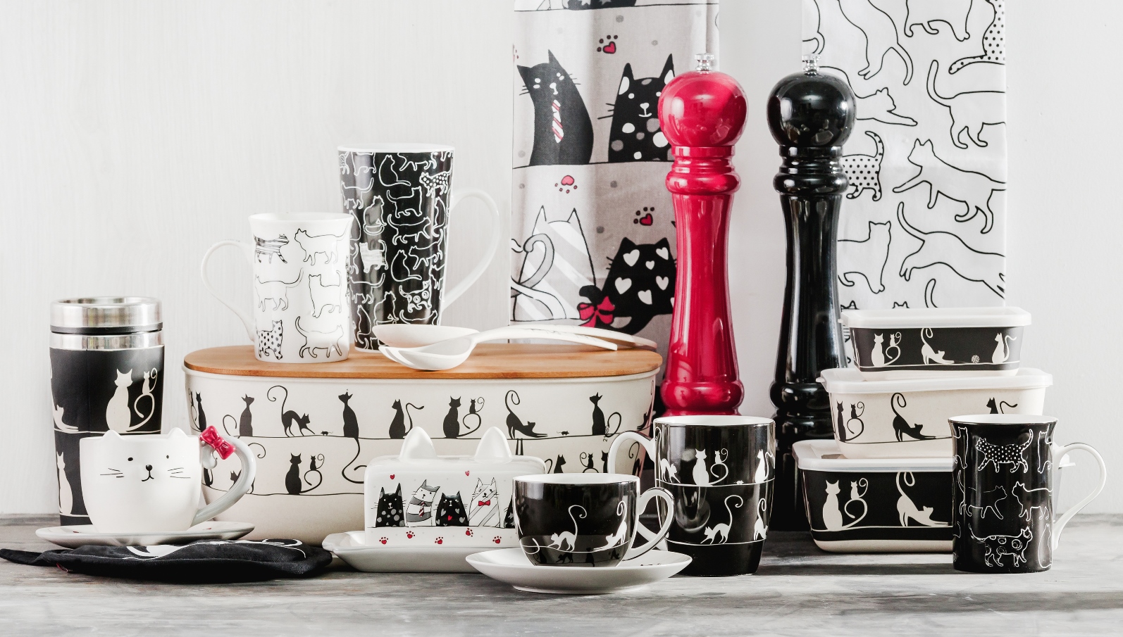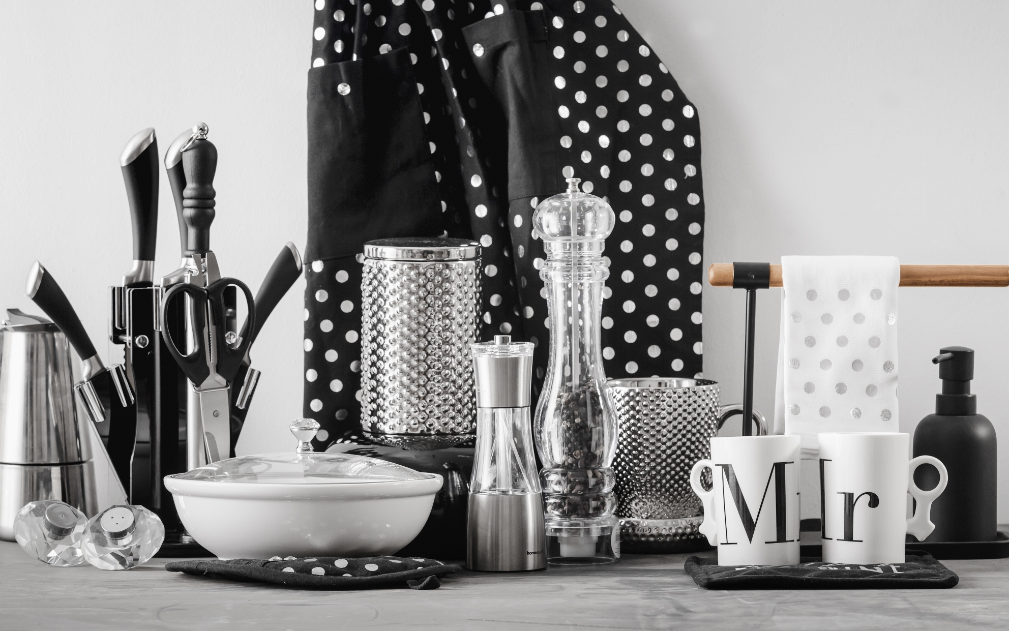 Czarno-białe przedmioty nie muszą być nudne. Świetnym przykładem jest komplet 3 pojemników wykonanych z włókna bambusowego z zabawnym wzorem w koty oraz kubki i czajniczki zdobione wesołymi napisami, pięciolinią lub ciekawymi printami. Także młynki do pieprzu lub spryskiwacze do sosów mogą łączyć w sobie funkcję praktyczną z dekoracyjną. Dzięki designerskiemu podejściu do przedmiotów codziennego użytku w kuchni, styliści home&you nadają szyk kuchennym niezbędnikom. Deska do krojenia z zestawem noży przeznaczonych do różnych produktów spożywczych sprawi, że kulinarne eksperymenty okażą się przyjemnością. A stojak na ręcznik lub wersja na książkę kucharską przypadnie do gustu każdemu wielbicielowi sztuki kulinarnej.