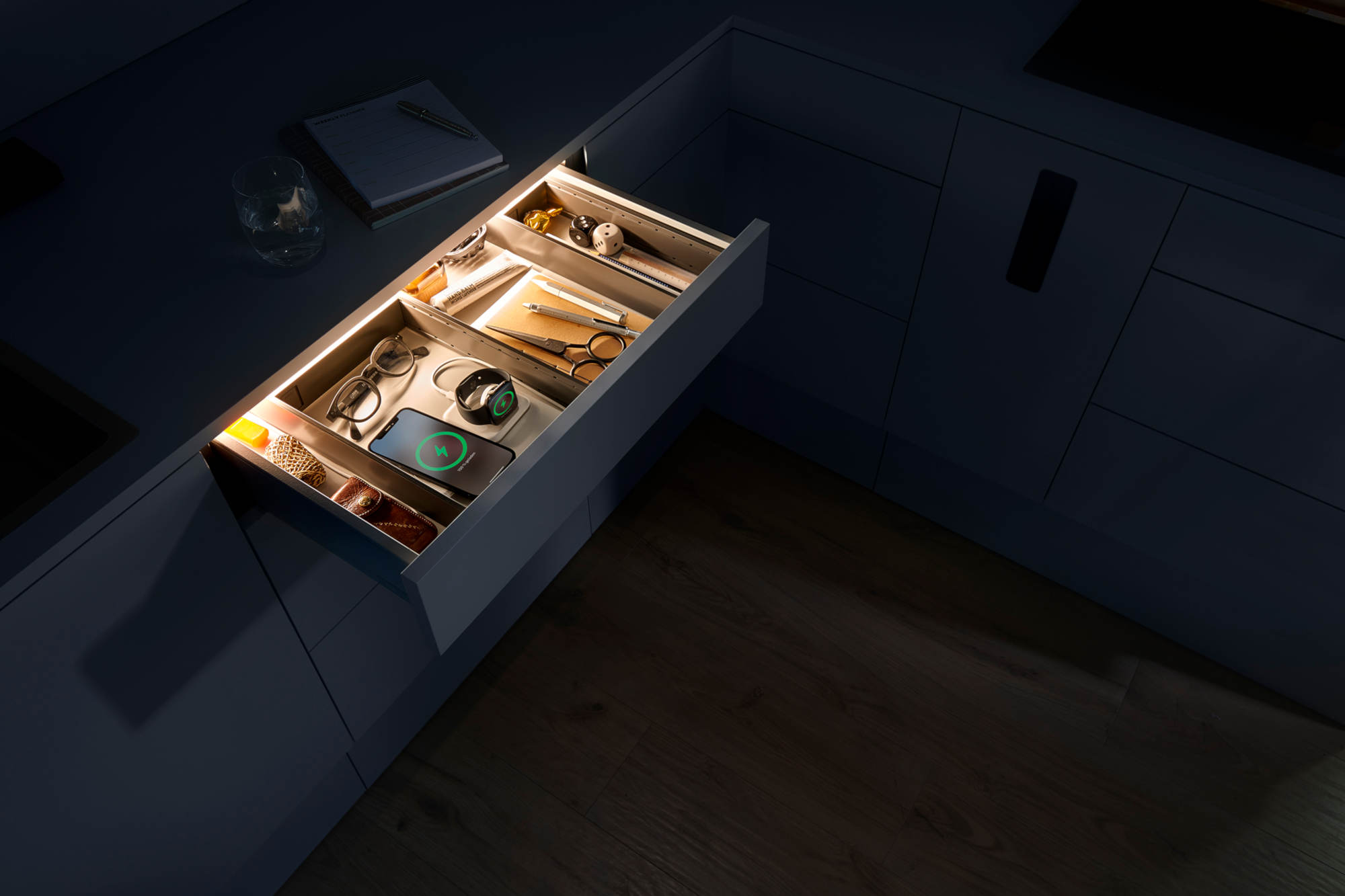 Na targach Blum zaprezentował dwa konkretne przykłady wykorzystania prądu w meblach – podświetlane szuflady i port USB-C. Światło w meblach ma przy tym dwojaki cel. Z jednej strony funkcjonalny, ponieważ zawartość szuflad jest podświetlona i dobrze widoczna. Z drugiej strony emocjonalny, ponieważ nastrojowe oświetlenie stanowi element dekoracyjny. Wejście prądowe, które firma Blum zamontowała w ściance tylnej, to bardzo uniwersalne złącze. Firma stawia tu na popularny standard USB-C, który umożliwia ładowanie inteligentnych urządzeń, takich jak smartfony, tablety czy laptopy, w miejscu, w którym są przechowywane. Co więcej, w ten sposób mogłyby być potencjalnie zasilane również akumulatorowe sprzęty kuchenne czy golarki elektryczne. Możliwe w przyszłości będzie także bezprzewodowe ładowanie dzięki integracji ładowarek indukcyjnych.