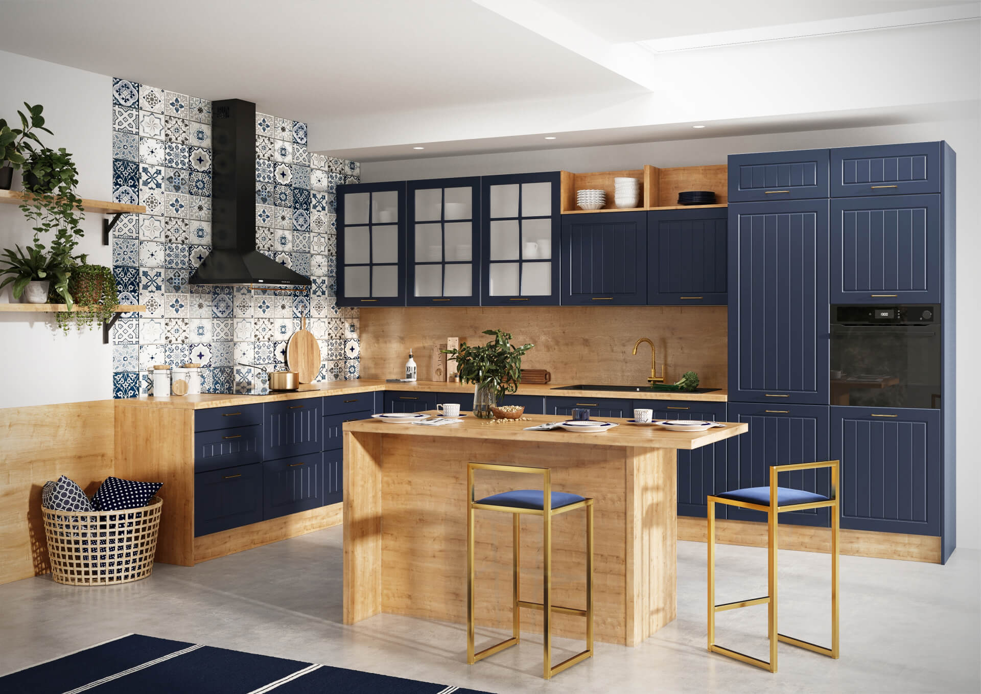 Złoto dodaje elegancji nie tylko w aranżacjach modowych. Fronty w ciemnych wybarwieniach, jak granat, prezentują się korzystnie w takiej oprawie, a kuchnia nabiera blasku i stylu. Fot. KAM