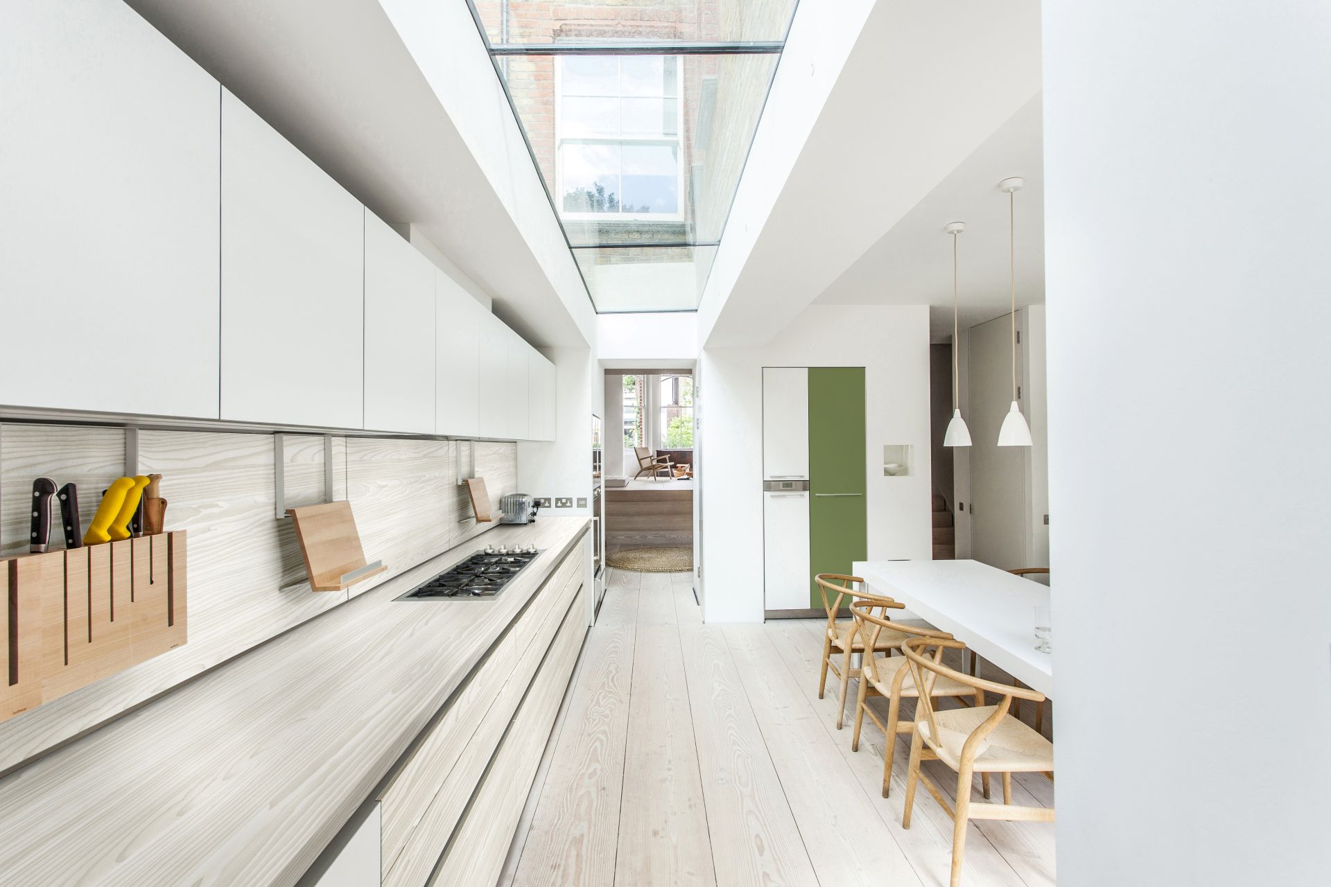 - James Wright of Macdonald Wright Architects’ home in London. A modern take on a Victorian built home. The kitchen and dining areas.