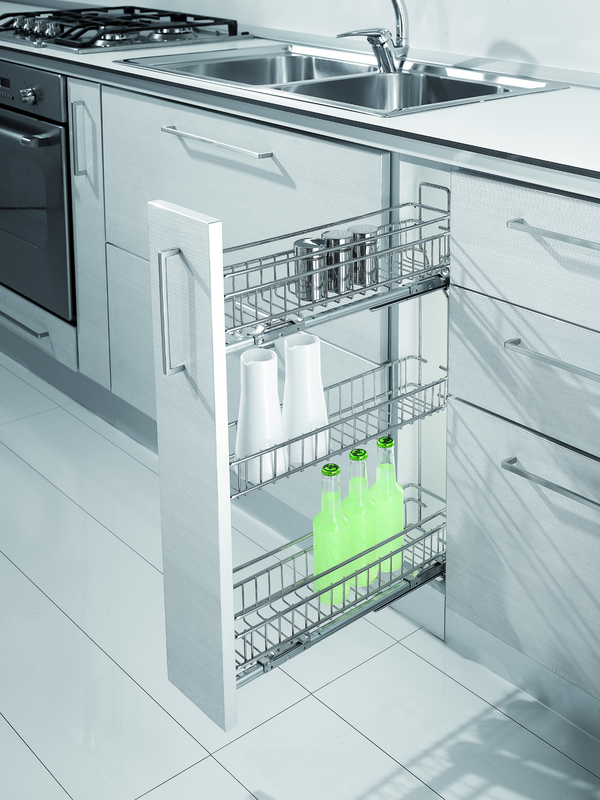 Wszystkie serie wyposażone są w system cichego domykania. W przypadku standardowej serii Quadro zastosowano prowadnice Salice, które dają możliwość 90% wysuwu. Natomiast prowadnice Hettich i Grass gwarantują pełen wysuw i bardzo stabilną pracę każdego systemu w obrębie trzech serii, w których są stosowane.