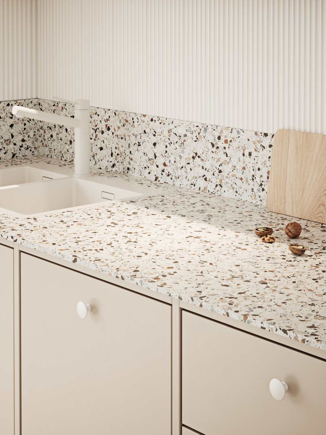 Kuchnia w szarym kolorze kojarzy się z nowoczesnym wnętrzem. Barwa ta, chociaż przez dekady uważana była za nudną, wyszła wreszcie z cienia, aby szturmem podbić współczesne aranżacje wnętrz. To świetnie, bo nam ona naprawdę wiele do zaoferowania. Nie tylko dodaje wnętrzom klimatu, ale też pięknie prezentuje się w postaci modnych betonów oraz kamienia. W nowej kolekcji blatów UltraFit Pfleiderer proponuje nam do wyboru aż trzy opcje szarości. Art Beton S60045 to nowoczesny beton, poprzecierany, o przenikających się ciepłych i zimnych odcieniach. Ma wyczuwalną strukturę stiuku, która nadaje mu niesamowitą autentyczność. Druga propozycja to Beton Loft S60044, ciemny, o głębokiej grafitowej barwie z mnóstwem delikatnych niuansów i detali. Piccolo Granito S61039 to z kolei wariacja na temat modnych powierzchni granitowych. Ten pełen drobnych kamyczków i plamek dekor, ma w sobie głębię i prezentuje się bardzo interesująco. Miłośnikom kamiennych wzorów z pewnością przypadnie do gustu także Abruzzo Colore S68048 – to dekor, który doskonale sprawdzi się jako akcent na frontach mebli, gdy zestawimy go ze stonowanymi unikolorami, z kolei zastosowany na cienkim blacie UltraFit, doda aranżacji wnętrza nonszalancji i charakteru. Jego powierzchnię zdobią kolorowe kamyczki o różnych kształtach – począwszy od szarych i beżowych, po różne odcienie brązu, pomarańczy i zachwycający ceglany róż.