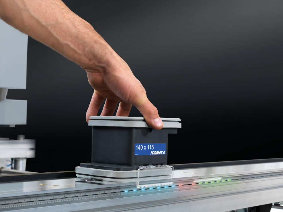 Unikatowe w skali światowej pozycjonowanie przyssawek przy pomocy diod LED dla centrów obróbczych CNC Format-4 profit H200, H300 oraz H350 zapewnia precyzyjne pozycjonowanie z dokładnością do milimetra za pomocą 500 pojedynczo sterowanych, białych diod LED na każdym metrze. Dodatkowe informacje, takie jak typy przyssawek lub status blokady maszyny itp., są wizualizowane za sprawą dodatkowych, umieszczonych co 20 milimetrów kolorowych diod LED w modelu przestrzeni barw RGB. Wszystkie diody LED umieszczone są w profilu aluminiowym ze skalą. Za przyciśnięciem guzika diody LED wskazują, przy pomocy zapisanych w programie maszyny informacji o obróbce, gdzie dokładnie należy umieścić poszczególne przyssawki. To rozwiązanie bardziej precyzyjne, szybkie i przejrzyste w porównaniu do konwencjonalnych systemów, które umożliwia pozycjonowanie wszystkich niezbędnych urządzeń mocujących w polu roboczym.