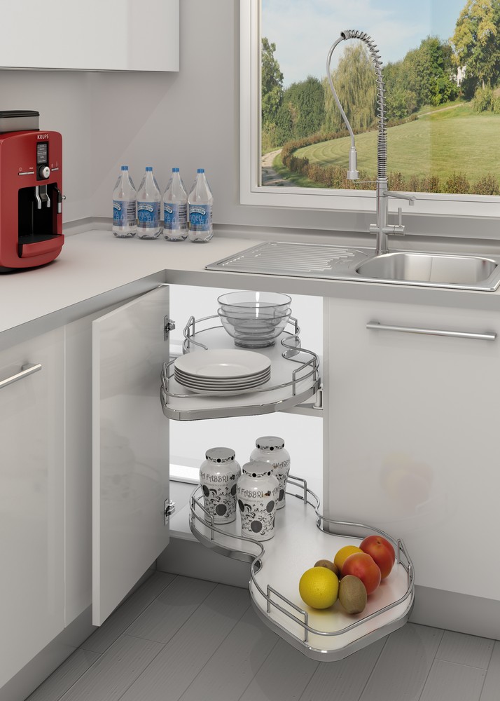 – Z kolei półki narożne pomagają lepiej zagospodarować szafki umiejscowione w rogu zabudowy meblowej. Dzięki nim zyskamy dodatkową przestrzeń do przechowywania, tak potrzebną w małej kuchni – mówi Jakub Malinowski z Häfele.