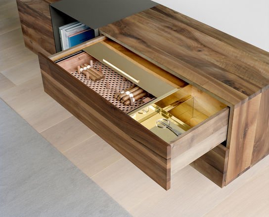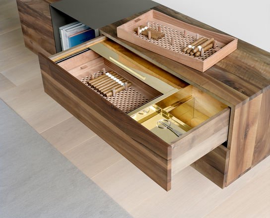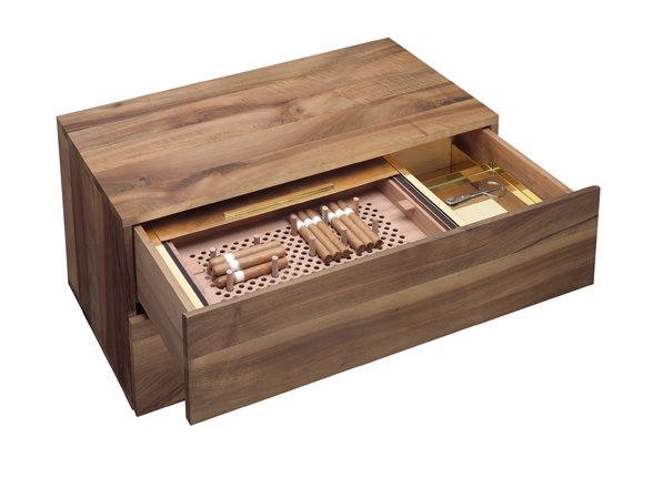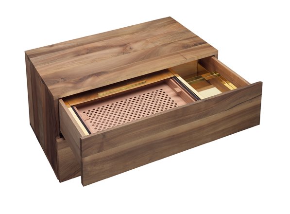Humidor -pojemnik do przechowywania cygar jest szczególnie cennym elementem kredensu dla wielbicieli cygar. MARTOUB zaprojektowany przez Philippa Mainzer jako element uzupełniający dla modułu stałego kredensu z drewna Mahnaz firmy e15. Ten charakterystyczny mebel z wyrafinowanym wnętrzem, posiada przestrzeń zamontowaną w jednej z szuflad oferującą miejsce na przechowywanie 150 cygar. Niezbędne dla prawidłowej kontroli klimatu i aromatu cygar, wnętrze wykonane jest hiszpańskiego drewna cedrowego. Ruchoma górna klapa z polerowanego mosiądzu lub stali nierdzewnej zapewnia zamknięte środowisko. Szafka jest dostarczana z wbudowanym urządzeniem, regulującym elektrycznie wilgotność wewnątrz szafki do 70%. Obok pojemnika na cygara, znajduje się przesuwna i zdejmowana tacka również z polerowanego mosiądzu lub stali nierdzewnej pozwalająca na estetyczne przechowywane podstawowych przyborów.