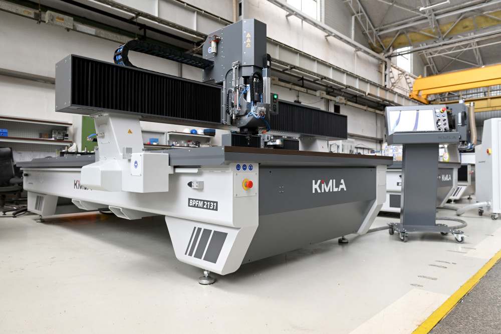 Przemysła Kimla dodaje: „Nasz system sterowania w maszynie ma zawsze korekcję średnicy narzędzia, ponieważ narzędzie po procesie ostrzenia ma za każdym razem troszeczkę mniejszą średnicę CNC. Zatem za każdym razem, montując narzędzie naostrzone trzeba wpisać poprawną wartość odsunięcia o grubość narzędzia od ścieżki po to, żeby detal wyszedł o odpowiedniej, zadanej wielkości. Wszystkie nasze maszyny mają standardowo system automatycznej korekcji średnicy narzędzia, który generuje sobie ścieżkę sam w taki sposób, żeby wielkość detalu, niezależnie od średnicy narzędzia, zawsze była taka sama. Kolejne dodatkowe, ale istotne wyposażenie w CNC to tzw. bazy, służące do bazowania materiałów. Mogą to być bazy wkładane, czyli specjalne trzpienie wkładane w stół, ale mogą być również bazy zautomatyzowane, chowane pneumatycznie, sterowane systemem sterowania. Mogą być również inne systemy pozycjonująco-przytrzymujące materiał, choćby stoły hybrydowe o dużej gęstości rowków, z których można odsysać powietrze po to, żeby można było wykonywać na przykład wielkoformatowy nesting”.