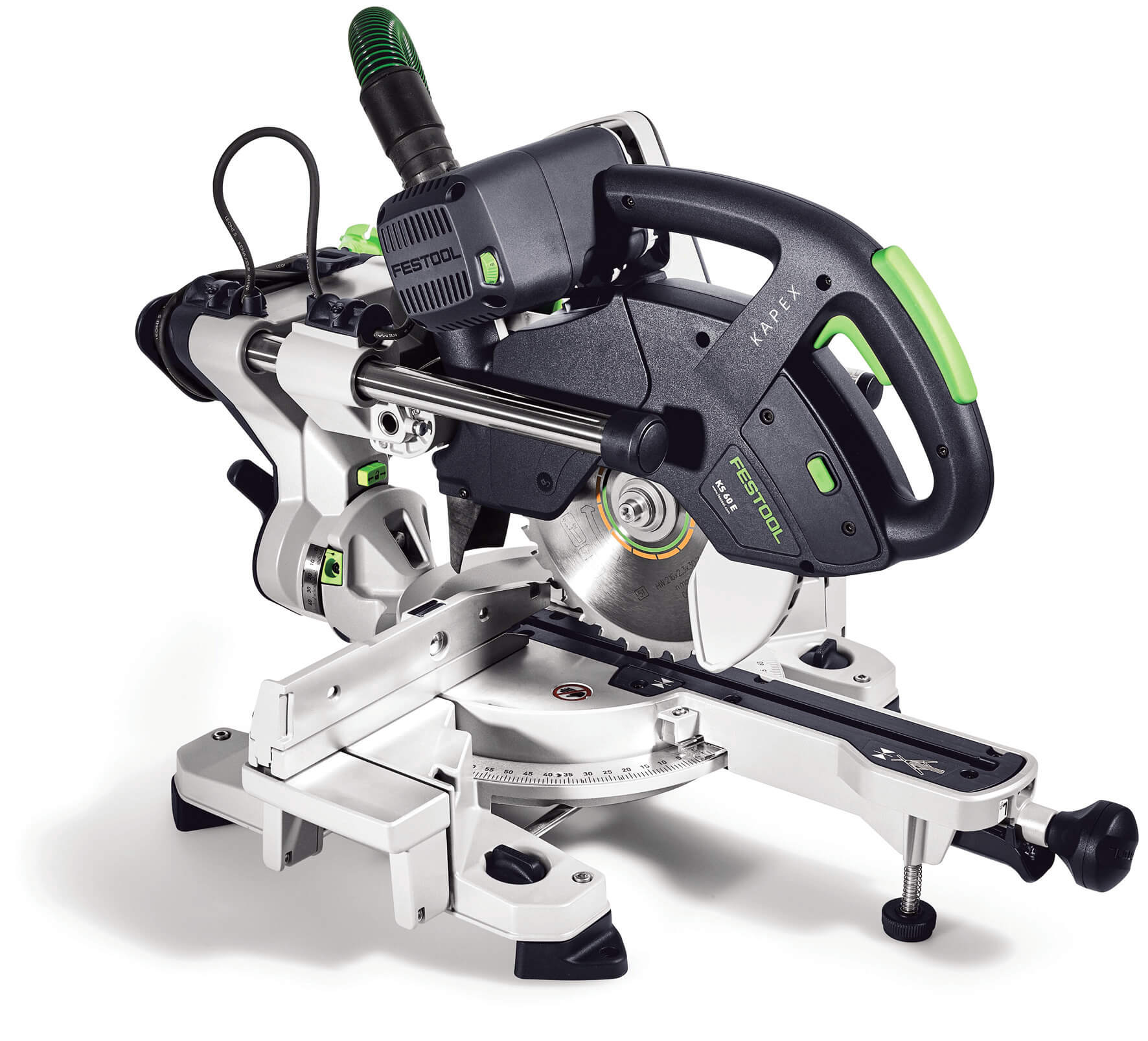 Przy cięciu drewna i innych materiałów powstają szkodliwe pyły. Kapex KS 60 dysponuje – jak to w Festool – możliwością łatwego podłączenia odkurzacza w celu łatwego zachowania czystości w otoczeniu pracy. By praca na stojąco była ergonomiczna, a transport na plac budowy wygodny, uciosarkę przesuwną można wstawić w nową jeżdżącą podstawę UG-KAPEX KS 60.