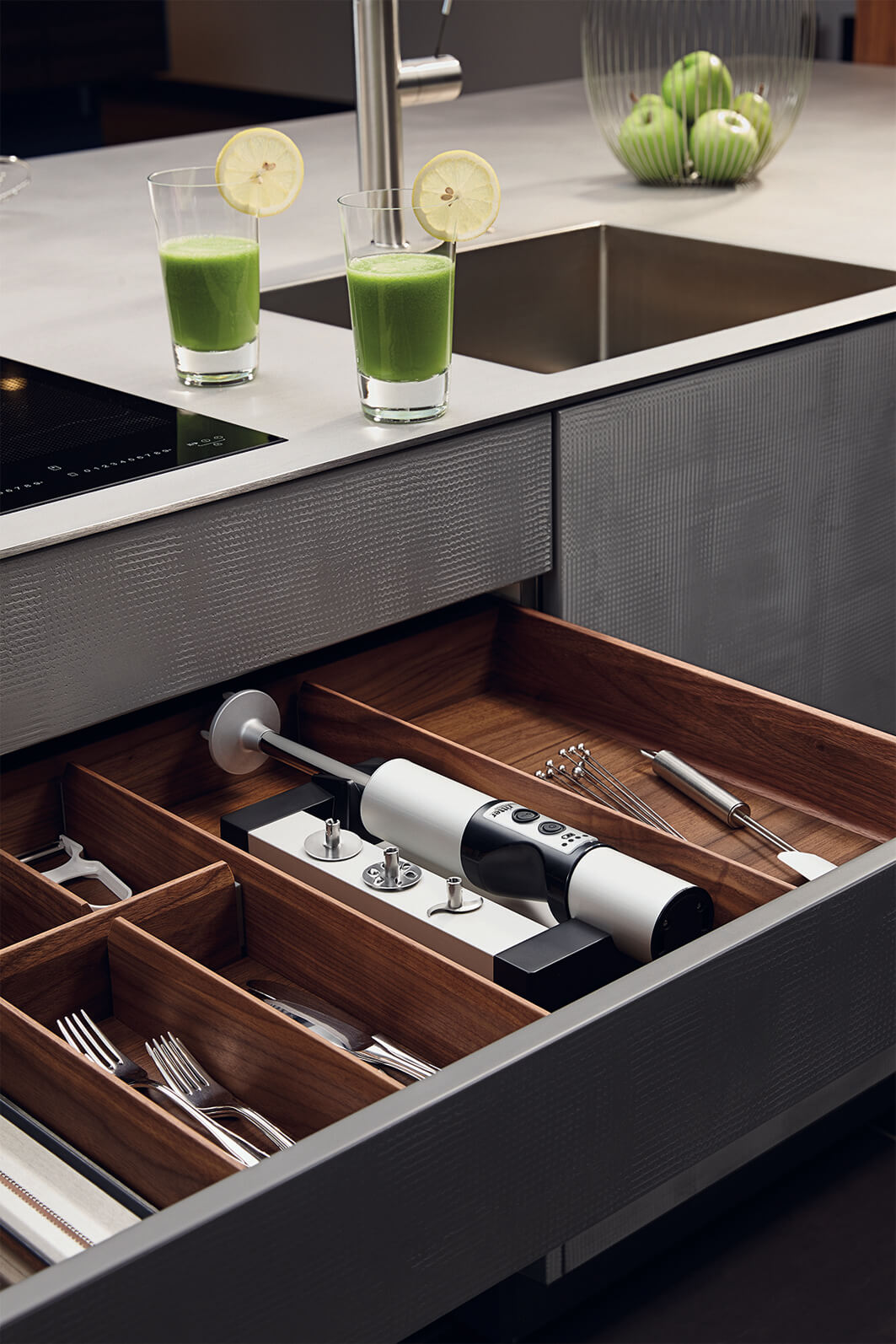 W blenderach zastosowane zostały akumulatory litowo-jonowe o pojemności 2,1 Ah i napięciu 7,2 Volt. Inteligentna technika ładowania, wykluczająca efekt powstania przeładowania, zapewnia ich długą żywotność. Wskaźnik LED pokazuje aktualny poziom naładowania akumulatora. Stacje bazowe zapewniające ładowanie i przechowywanie blenderów montuje się w szufladach. Ich demontaż, celem czyszczenia, odbywa się bez użycia narzędzi.