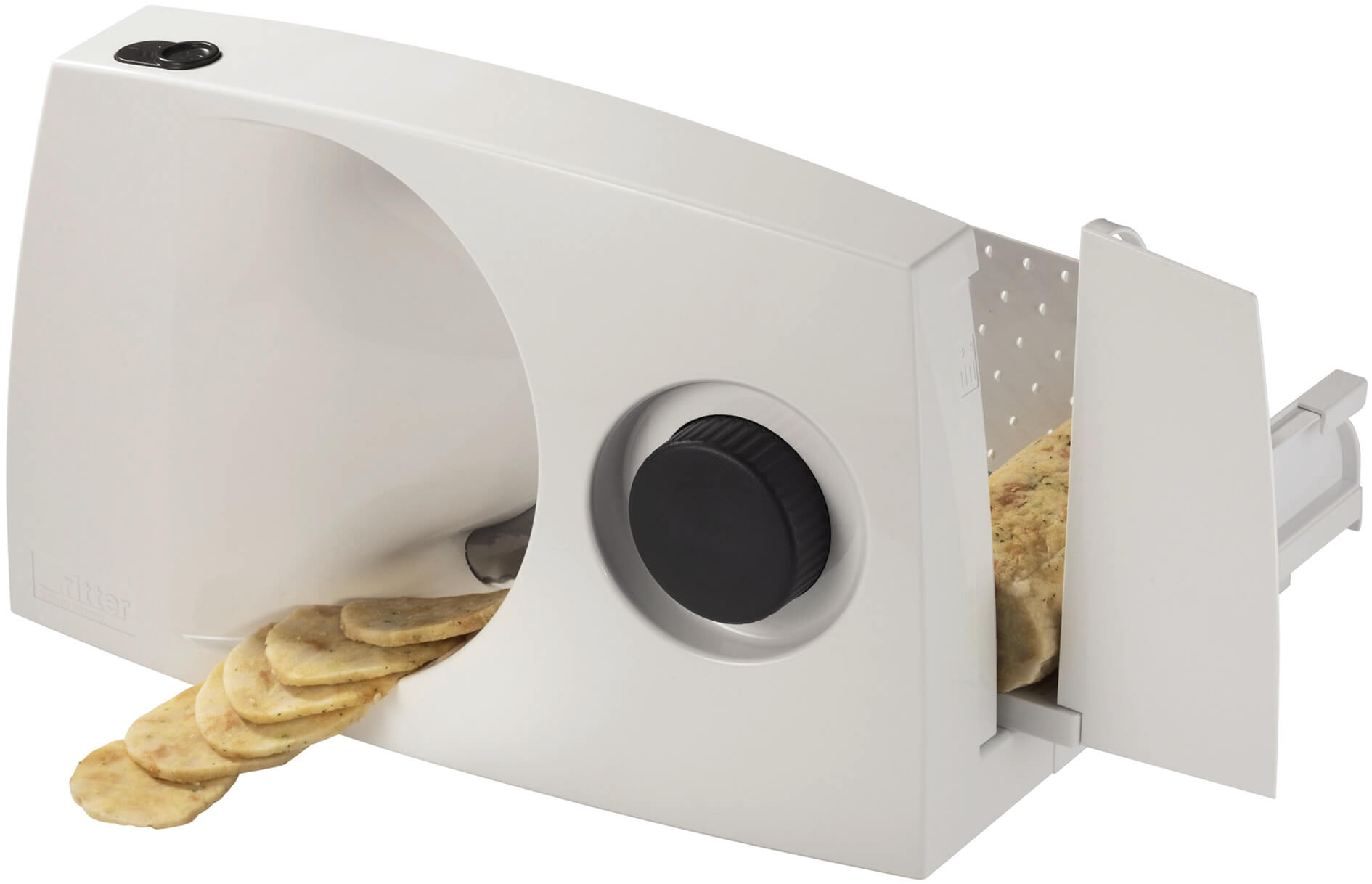 Ten model w stanie złożonym ma tylko 10,5 cm szerokości. Wykonano go z łatwego do utrzymania w czystości tworzywa sztucznego w kolorze białym. Dzięki dzielonym saniom roboczym krajalnica zawsze jest kompletna, także w stanie złożonym. Grubość krojenia jest ustawiana bezstopniowo do około 14 mm. Maszyna posiada składany stolik roboczy. Do kompletu dodawana jest szalka na krojone produkty.