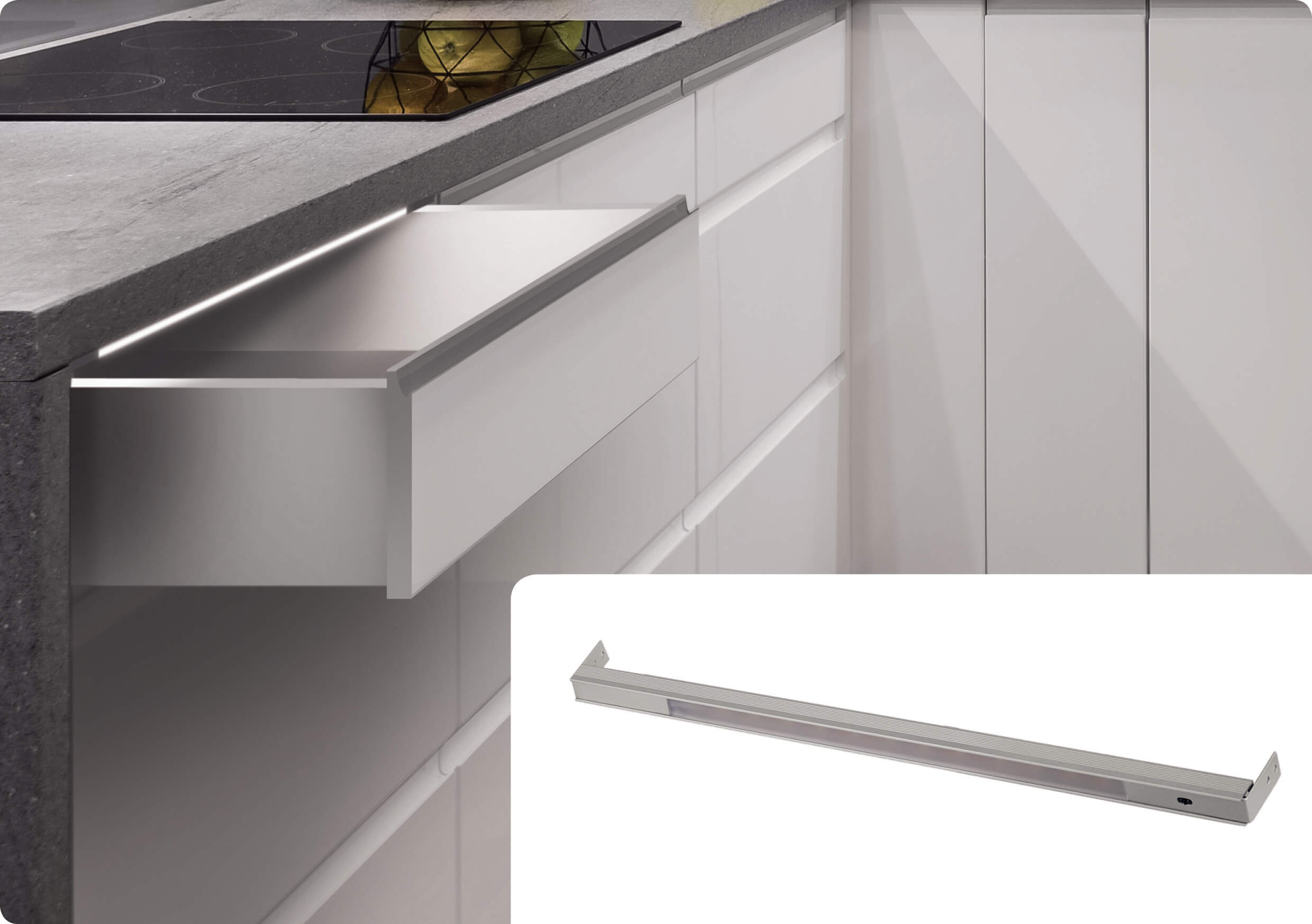 Oprawa posiada wbudowany wyłącznik zbliżeniowy, który automatycznie włącza oświetlenie po otwarciu szuflady i wyłącza po jej zamknięciu.