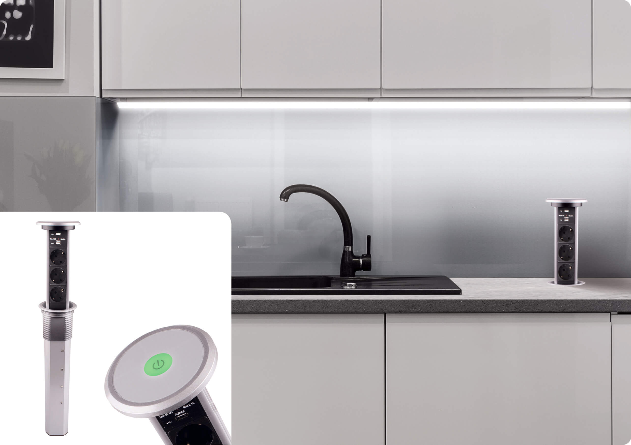 Firma Design Light oferuje także szeroką gamę przedłużaczy. LIFT BOX to gniazdo meblowe, które znajduje zastosowanie jako przedłużacz czy dodatkowe gniazda do zasilania lub ładowania USB w blacie. W razie potrzeby użytkownik w łatwy sposób wyciąga je ponad blat. LIFT BOX to małe gniazdo niezajmujące wiele miejsca, montuje się je w otwór o średnicy