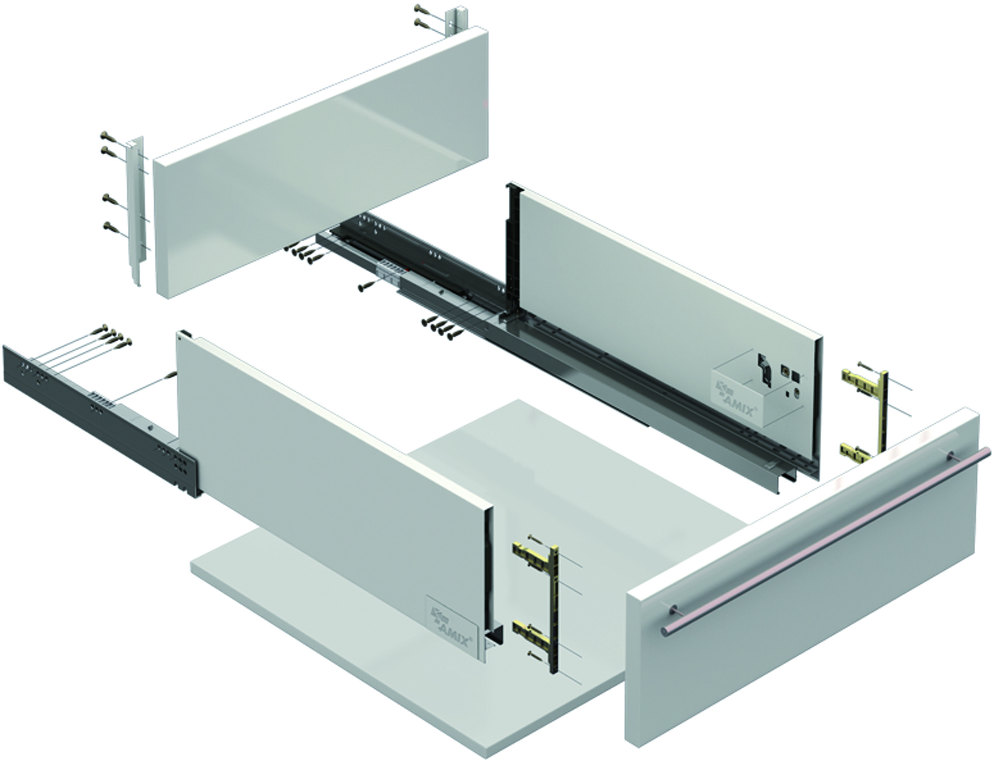 Ofertę firmy Amix wzbogaciła nowa wersja Systemu Box przeznaczonego do zabudowy szuflad – SB10 Slim Box. Jest to jedyny system w Polsce, w którym frezowanie dna szuflady jest zbędne. Wsuwając dno w boki, eliminujemy jego wystawanie poza obrys szuflady. Jest to zupełnie nowy wymiar montażu – znacznie skraca się czas i zmniejsza koszt realizacji zamówienia. Docenią to zarówno stolarze, firmy meblarskie, jak i sami klienci końcowi.
