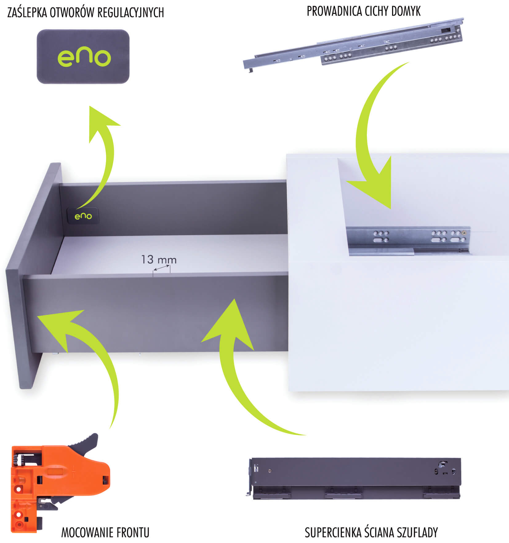 System szuflad ENO z powodzeniem może być wykorzystywany zarówno w kuchni, w pokoju, jak i w łazience. Trzy dostępne wysokości (89, 121 oraz 185 mm) umożliwiają stosowanie szuflad w różnego rodzaju wnętrzach, a klasyczna, modna kolorystyka bieli (8081) i antracytu (8082) oraz minimalistyczny design na perfekcyjne dopasowanie do niemal każdego mebla. System można również wzbogacić akcesoriami, które pozwolą na montaż szuflad wewnętrznych. Na taką opcję warto się zdecydować na przykład przy aranżacji garderoby.