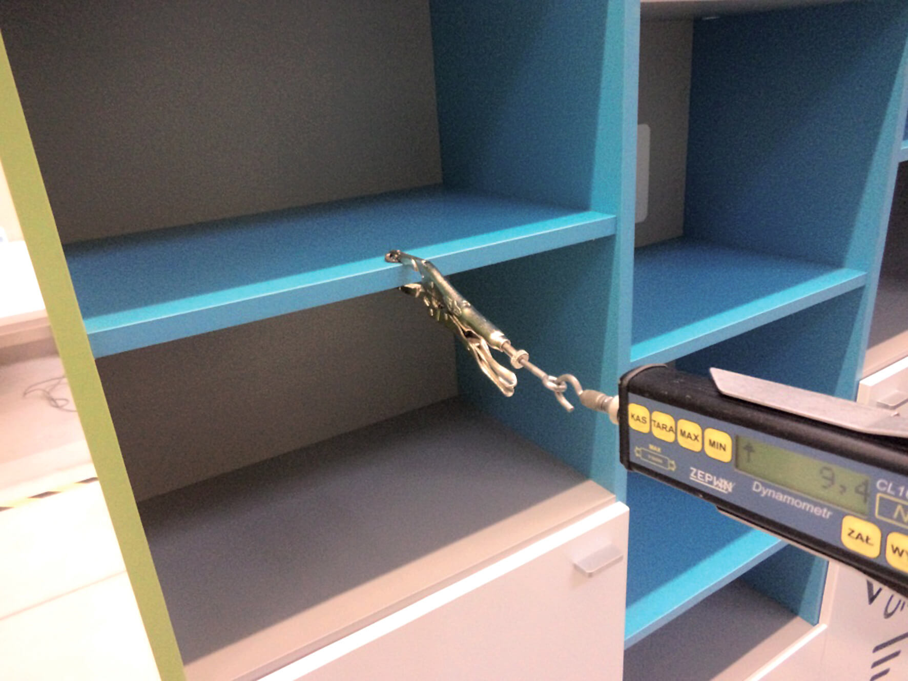 Dalsze wymagania względem mebli do przechowywania dotyczą wyciągania półek, wytrzymałości podpór półek, wytrzymałości powierzchni wieńca górnego, wytrzymałości elementów wysuwanych i dynamicznego otwierania elementów wysuwanych. Bada się również ograniczniki blokujące otwarcie, obciążenia pionowe drzwi obrotowych, dynamiczne otwieranie drzwi przesuwnych i poziomych frontów żaluzjowych oraz wytrzymałość klap.