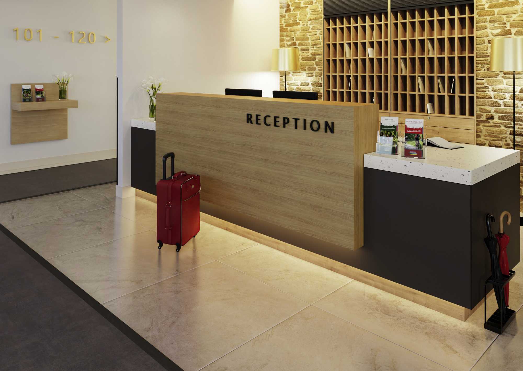 Do projektowania recepcji hotelowej wybrano obrzeże dąb Hamilton naturalny miniperl firmy Ostermann w klasycznym, miodowym odcieniu. Obrzeże stosowana jest w kilku miejscach w różnych szerokościach.