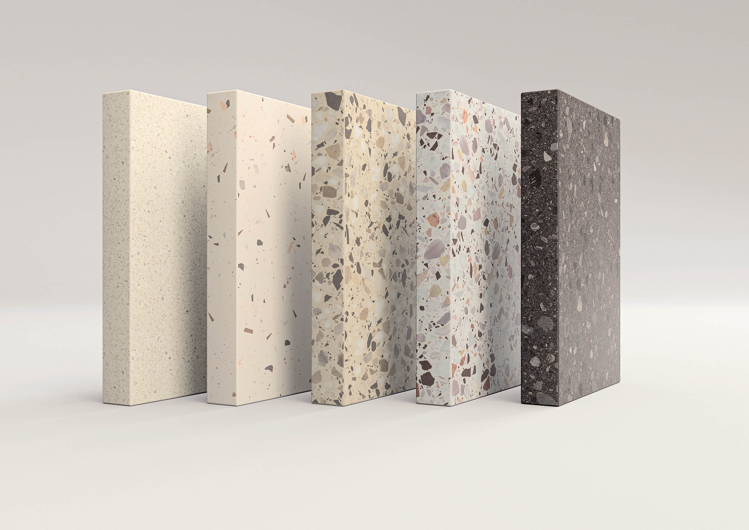 Liczni producenci płyt oferują teraz w swoich aktualnych kolekcjach dekory w optyce Terrazzo. Paleta kolorów sięga od ciemnego antracytu do jasnego beżu lub bieli z różnymi inkluzjami. Firma Ostermann oferuje obrzeża w optyce Terrazzo dopasowane do różnorodnych powierzchni.