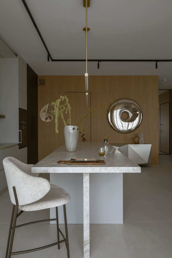 Jadalnię oddziela od kuchni wyspa z jasnego kwarcytu Taj Mahal, oświetlona lampą Ambrosia Marset. Przestrzeń zaprojektowano ją jako wizualne przedłużenie strefy dziennej. Zabudowy kuchenne, utrzymane w spokojnej palecie barw, kryją sprzęty AGD i zaplecze gospodarcze.