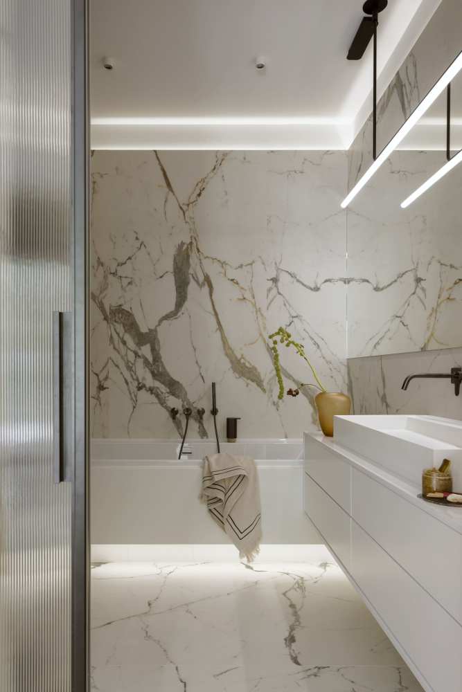 Część prywatną pracownia HOLA Design zaprojektowała jako strefę spokoju i regeneracji. W sypialni uwagę przyciąga tapicerowana ściana zagłówka oraz delikatne, wiszące lampy Aromas del Campo, budujące intymny, wieczorny nastrój. W łazience liczy się detal; od ukrytych linii światła po starannie dobrane akcesoria, które nie konkurują z architekturą, lecz ją dopełniają.