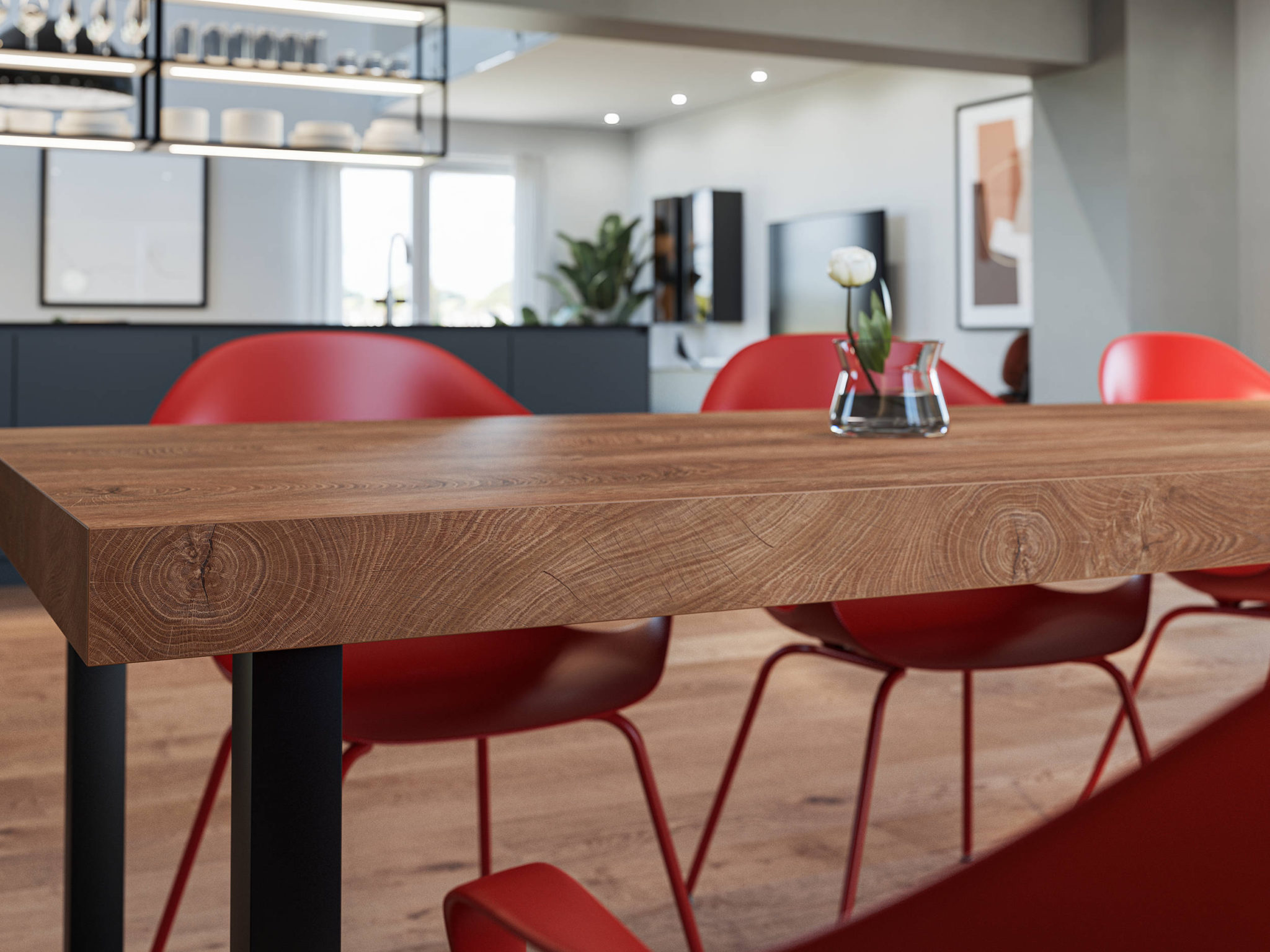 Przy tworzeniu nowego obrzeżu szczególny nacisk położono na harmonijne dopasowanie elementów drewna ciętego wzdłuż z elementami słojów drewna. Poza tym należało elegancko wkomponować typowe dla dekoru rustykalne otwory po sękach. Dlatego przy nowym obrzeżu elementy sęków zostały zastosowane specjalnie do przejścia od strony podłużnej do słojowej. Jeśli spojrzymy wzdłuż obrzeży, wydłużone struktury prowadzą zagiętymi liniami wokół otworu po sękach. Następnie elegancko łączą się ze słojami rocznymi.