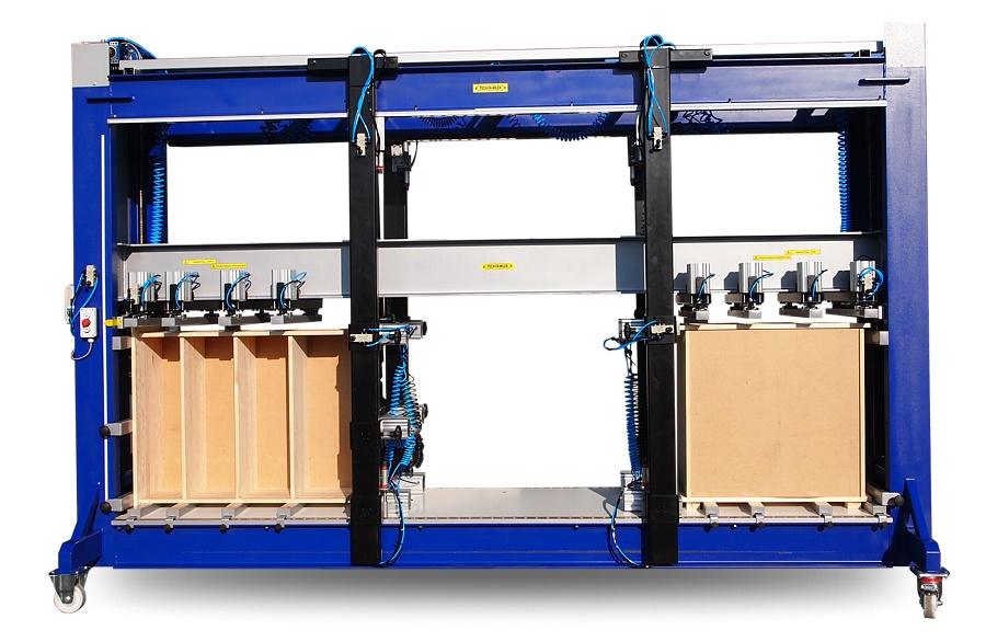 Do klejenia i montażu korpusów meblowych typu: szafka, szafy, kredensy, regały, komody, półki itp. przeznaczona jest prasa montażowa PMKM z jednym lub dwoma polami załadowczymi. Urządzenie wyposażone jest w jedną/ dwie belki dociskowe, które działają w układzie pionowym oraz w jedną belkę działającą w układzie poziomym, przestawianą bezstopniowo góra-dół za pomocą motoreduktora. Każda belka wyposażona jest w siłowniki pneumatyczne tłokowe sterowane zaworem z dźwignią ręczną. Siła docisku głównego regulowana jest reduktorem ciśnienia, a siłowników tłokowych – filtroreduktorem powietrza.