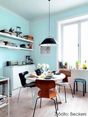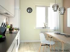 Jeśli kuchnia w kawalerce jest na tyle mała, że wyklucza miejsce na wspólne posiłki, warto przeznaczyć na ten cel dodatkowy kącik w pokoju dziennym i tam ustawić stół. Zamiast zastawiać nim całą ścianę, można umieścić okrągły model na środku pomieszczenia, dzięki czemu będzie mogło przy nim zasiąść więcej osób. By budować wrażenie przestrzeni, ściany można pomalować na jasny kolor Simple, który będzie odbijać światło. Stosując farbę Beckers Designer Kitchen & Bathroom umożliwiającą łatwe usuwanie plam, na dłużej zachowamy też świeżość wystroju.