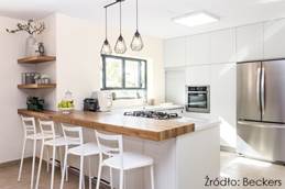 Jeśli kuchnia jest otwarta na salon, warto postawić na zamykane szafki. Dopasowane stylem do całości wnętrza fronty mebli kuchennych ujednolicą przestrzeń, a jednocześnie pozwolą na utrzymanie porządku. W ten sposób niezapowiedziane wizyty gości nie będą musiały kończyć się sprzątaniem kuchni w popłochu. Od nieefektownych plam i zabrudzeń na ścianach uchroni zaś odporna na wnikanie tłuszczów farba Beckers Designer Kitchen & Bathroom. Pomalowane nią ściany w kolorze Linen White będą smacznie współgrać z mlecznymi szafkami i wniosą do aranżacji odrobinę ciepła. Wysoki bar z drewnianym blatem stylowo oddzieli zaś strefę jadalną, tworząc przytulny klimat do rozmów.