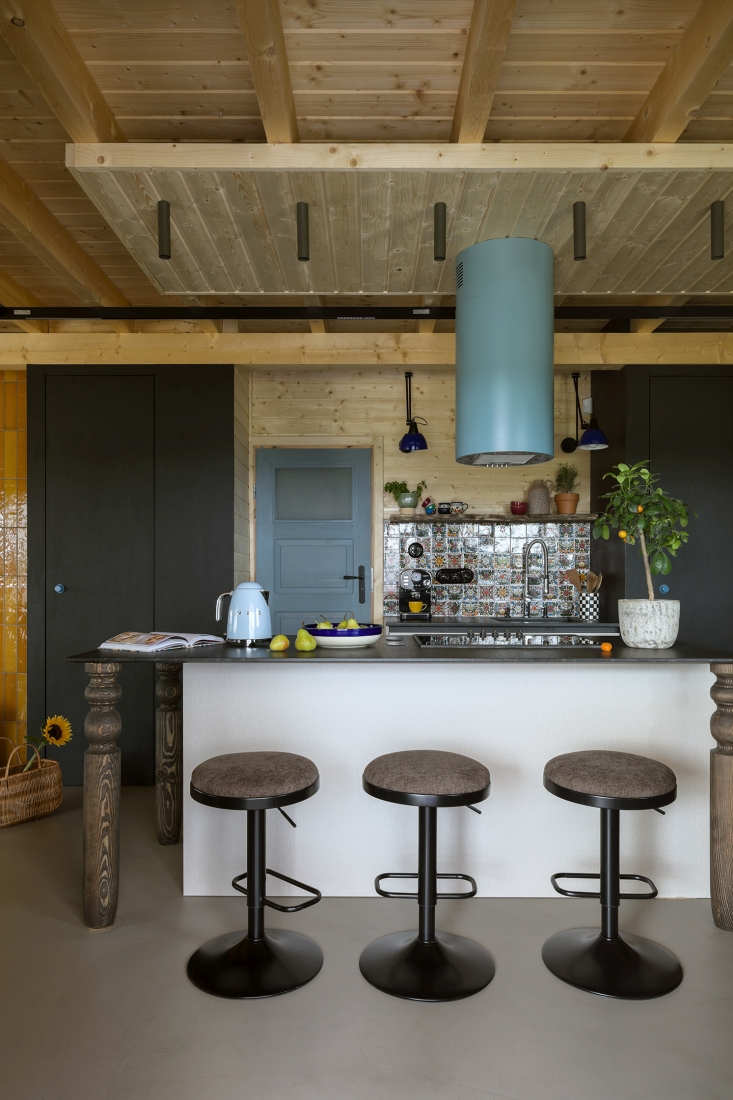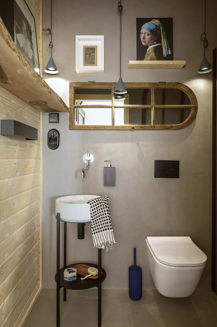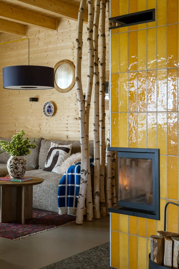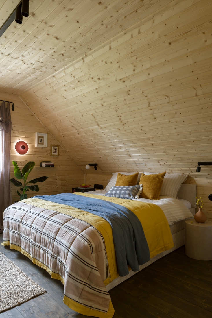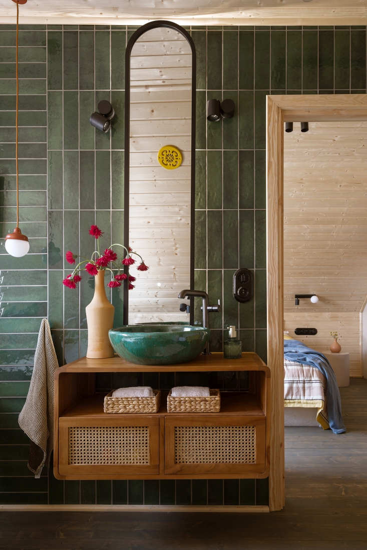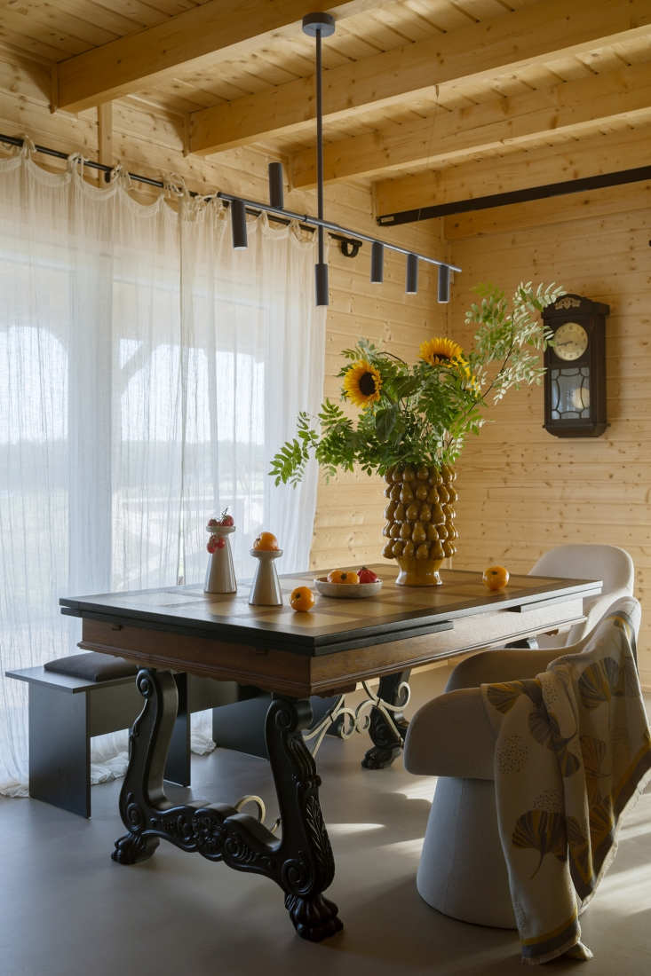 Oczywiście charakter wnętrza budują detale: ścianka działowa z pni brzozy, tłoczone nogi wyspy kuchennej, ceramiczny osprzęt czy umywalka wykonana na specjalne zamówienie z subtelnym odciskiem koronki. Te elementy wprowadzają miękkość i autentyczność, daleką od katalogowej powtarzalności. Ważną rolę odgrywają także meble i przedmioty, które inwestorka miała już wcześniej: stary stół, biurko po renowacji, zabytkowy zegar czy łóżko w sypialni. W zestawieniu z nowoczesnymi formami i minimalistycznym oświetleniem tworzą spójną, eklektyczną narrację – wiejski dom bez cepelii, nowoczesny, ale zakorzeniony w miejscu.