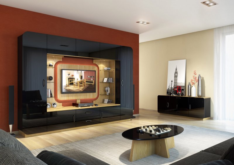 Daleko jej od klasycznej,3-piętrowej konstrukcji, jednak w meblu zachowano podziały: pionowe (półszafy: lewa i prawa) i poziome (szafka dolna i górna). Po środku znajduje się jej otwarta część z panelem TV i szklanymi półkami w narożnikach – pomiędzy nimi powstaje przestrzeń, przez którą widać ścianę. Daje to możliwość komponowania koloru ściany z jasną, naturalną okleiną dębową. W meblu zastosowano ciemne szkło oraz punktowe oświetlenie LED. Meblościanka może posiadać wymiar 216x310cm, a za sprawą jej funkcjonalnej organizacji można łatwo zarządzać przechowywanymi przedmiotami. Dopełnieniem kompozycji może być niewielki owalny stolik kawowy wsparty na krzyżakowym stelażu oraz szafka typu barek utrzymana w tej samej stylistyce. Mebin oferuje kilkanaście rodzajów brył, z których można skomponować własną niepowtarzalną meblościankę.