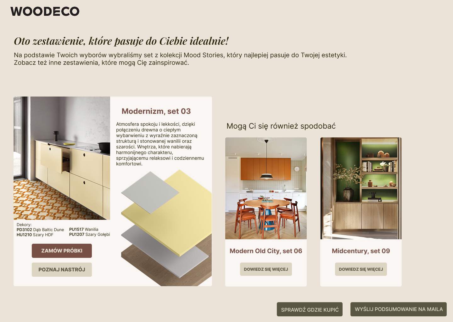 DecoMate to nie tylko solidna dawka inspiracji, po zakończeniu quizu użytkownik otrzymuje pełne zestawienie dekorów wraz z możliwością zamówienia próbek bezpośrednio z poziomu aplikacji. Może je również obejrzeć i skonsultować w jednym z punktów Woodeco Partner, co zwiększa jego komfort i skraca czas decyzji zakupowej. To szczególnie ważne dla stolarzy, dystrybutorów i projektantów, którzy szukają efektywnego sposobu prezentacji oferty.
