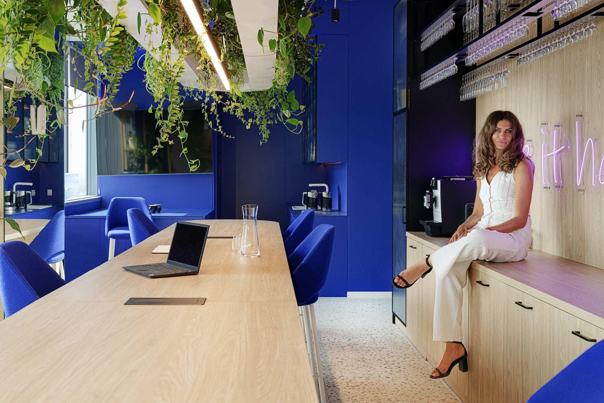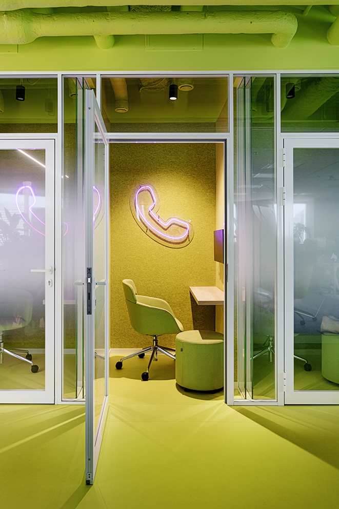 Układ biura oparto na otwartej strukturze uzupełnionej o szklane przegrody, które wydzielają poszczególne sekcje, nie odbierając przy tym poczucia przestronności. Podczas projektowania architekci zadbali również o rozwiązania sprzyjające pracy indywidualnej. Strefy cichej pracy utrzymane zostały w neutralnych, stonowanych kolorach, a komfort akustyczny zapewniają dźwiękochłonne budki telefoniczne, akustyczne sufity oraz filcowe wykładziny. Przestrzeń wzbogacono także o naturalną zieleń, w tym wiszące rośliny, które tworzą przyjazne środowisko dla pracowników. Całe wnętrze emanuje świeżością i dobrą energią, wiernie odzwierciedlając tożsamość firmy.